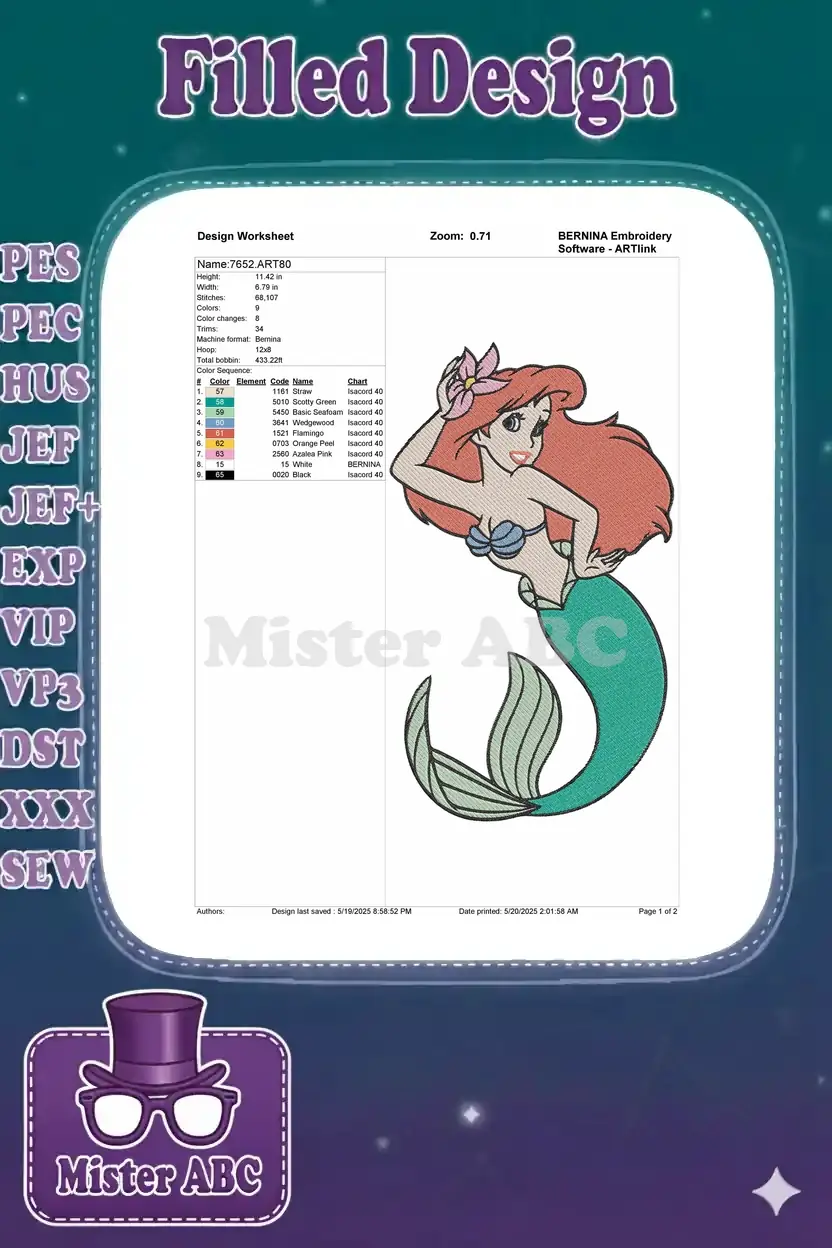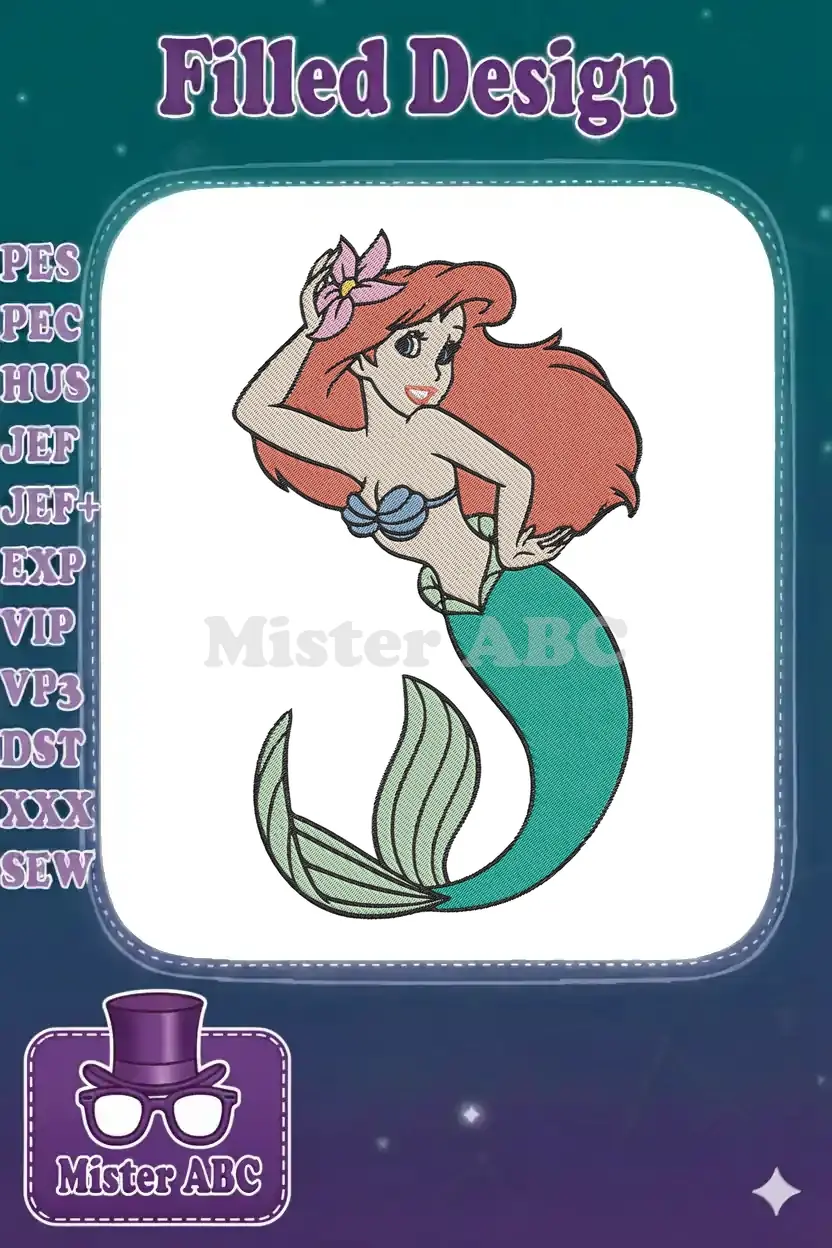 Ariel Little Mermaid princess red hair flower embroidery designs