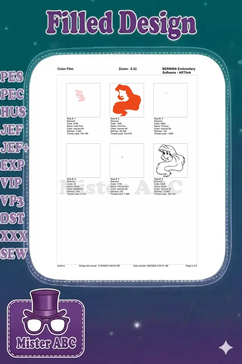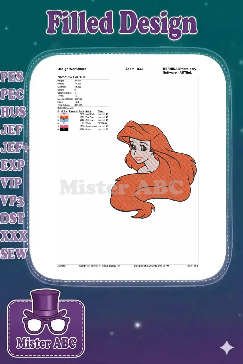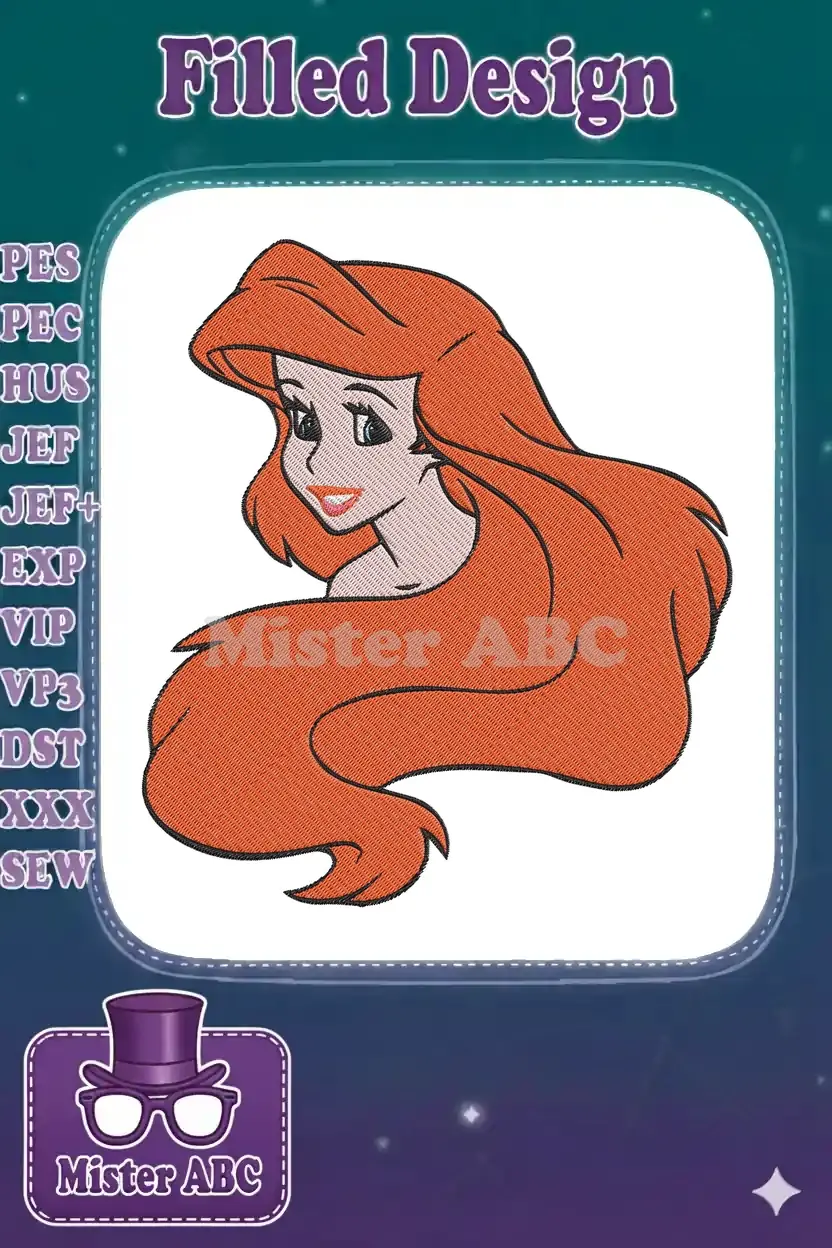 Ariel Little Mermaid Princess Red Hair Smiling Face Embroidery Designs