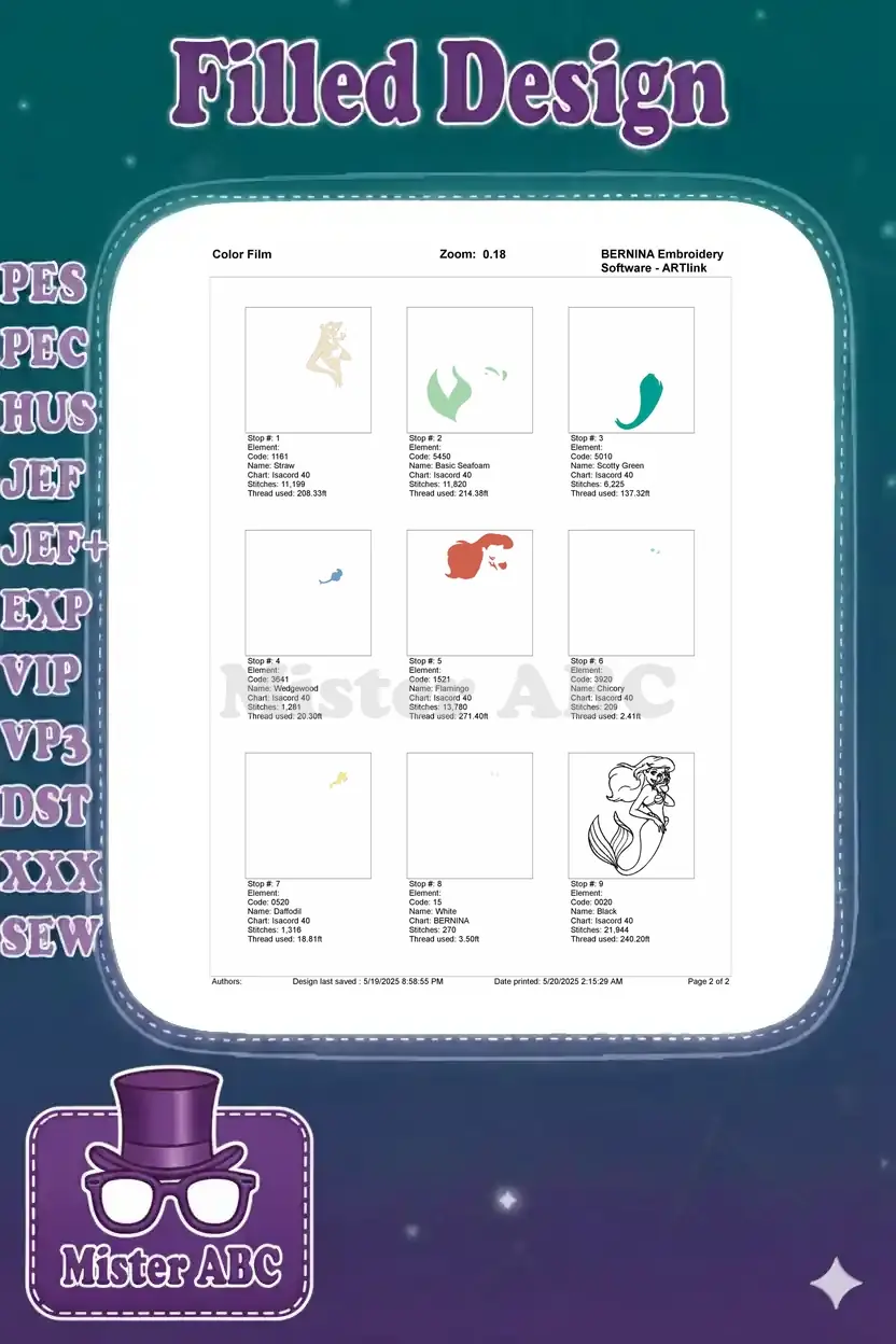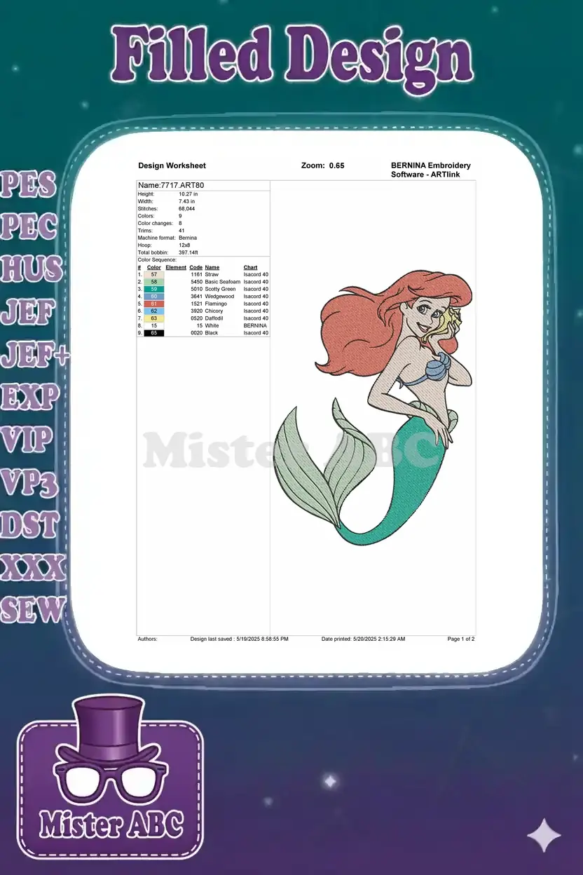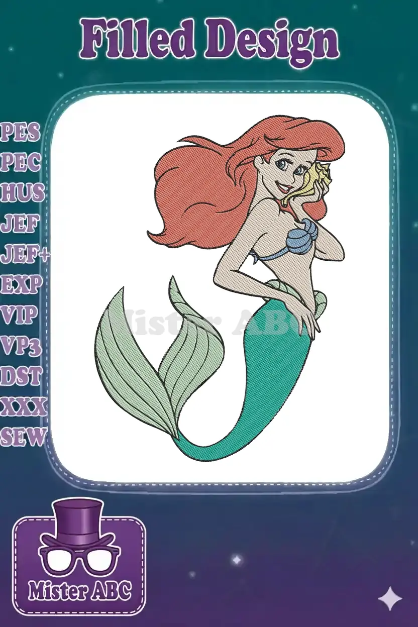 Ariel Little Mermaid Princess Red Hair Green Tail Embroidery Designs