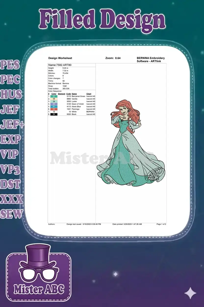 Stunning Ariel embroidery design, featuring the beloved mermaid princess in her elegant teal ballgown. A magical stitch for fans.