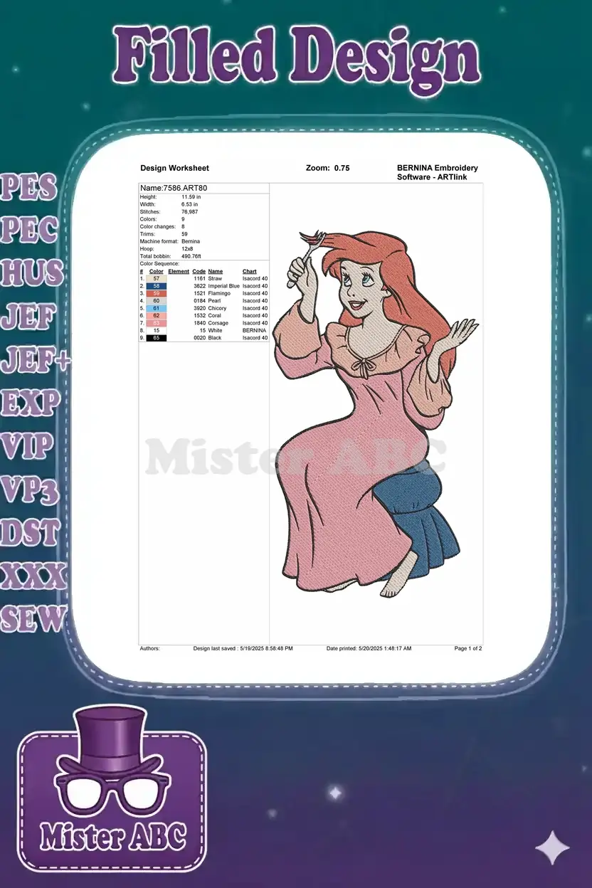 Ariel Little Mermaid Princess combing red hair with fork embroidery designs