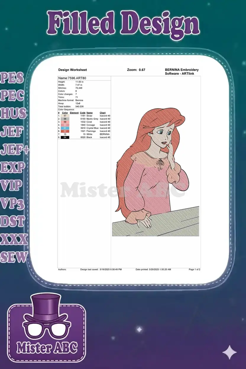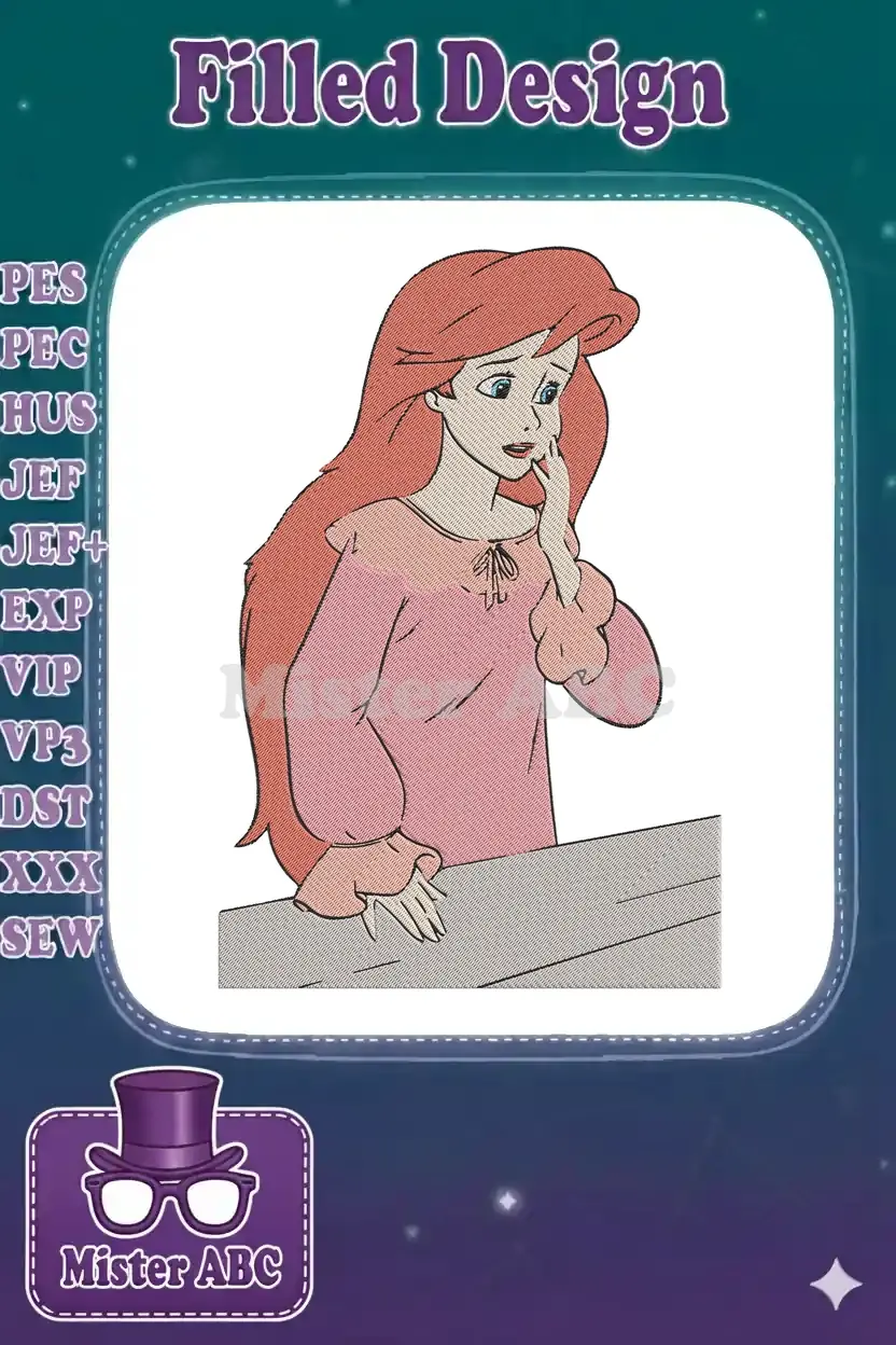 Ariel Little Mermaid Sad Princess Pink Nightgown Embroidery Designs