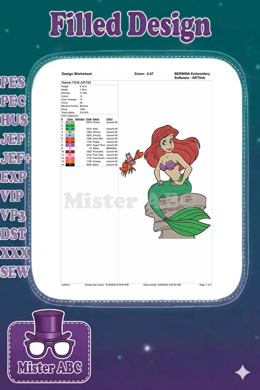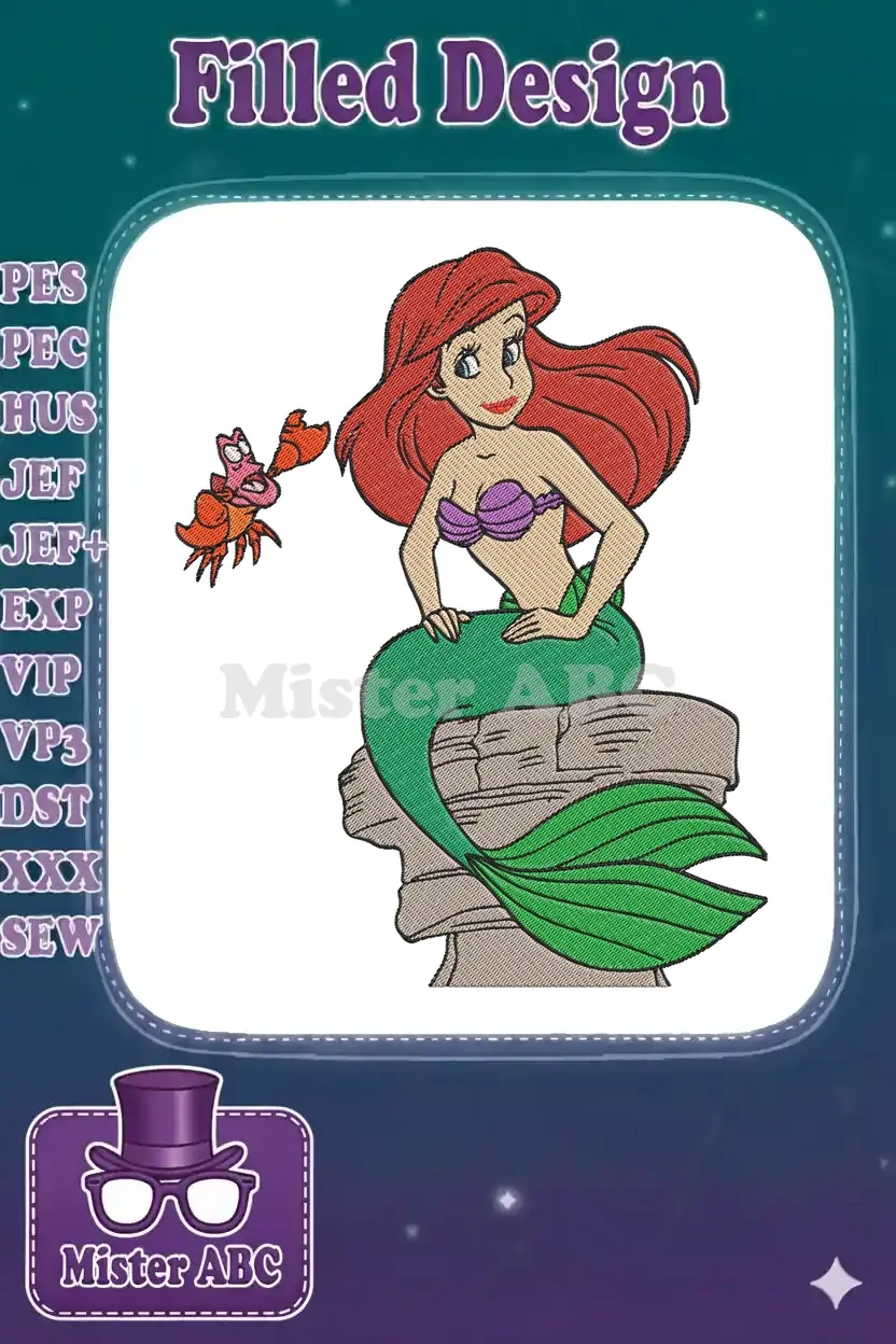 Embrace the magic of the sea with this enchanting Ariel and Sebastian embroidery design, perfect for any fan!