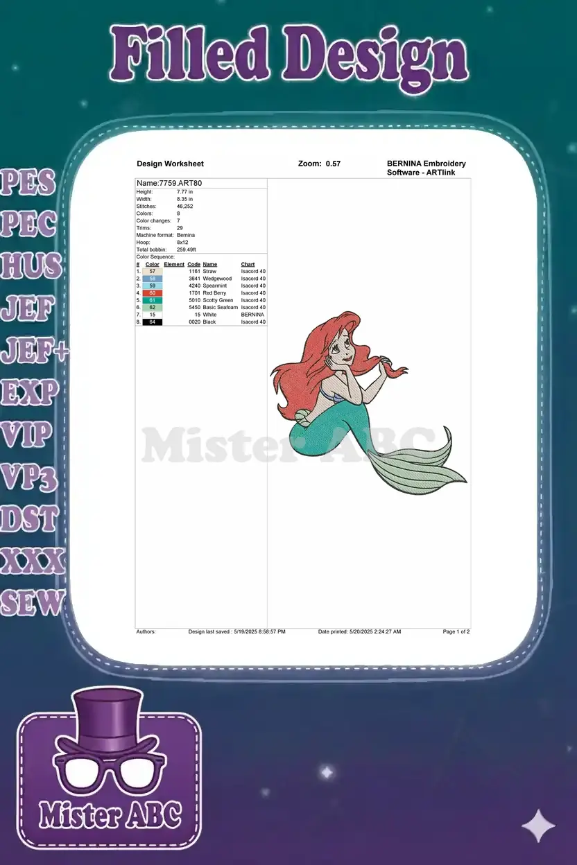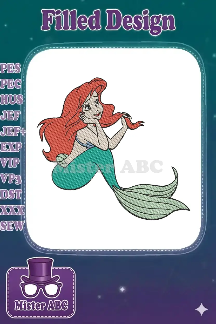 Ariel The Little Mermaid thoughtful princess red hair embroidery designs