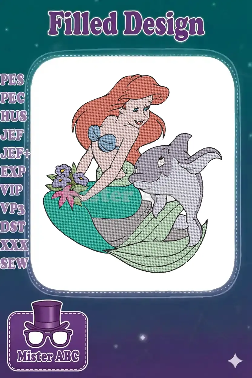 Ariel Mermaid and Dolphin with Flowers Embroidery Designs