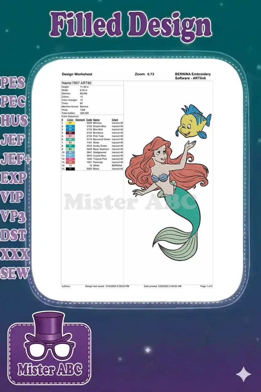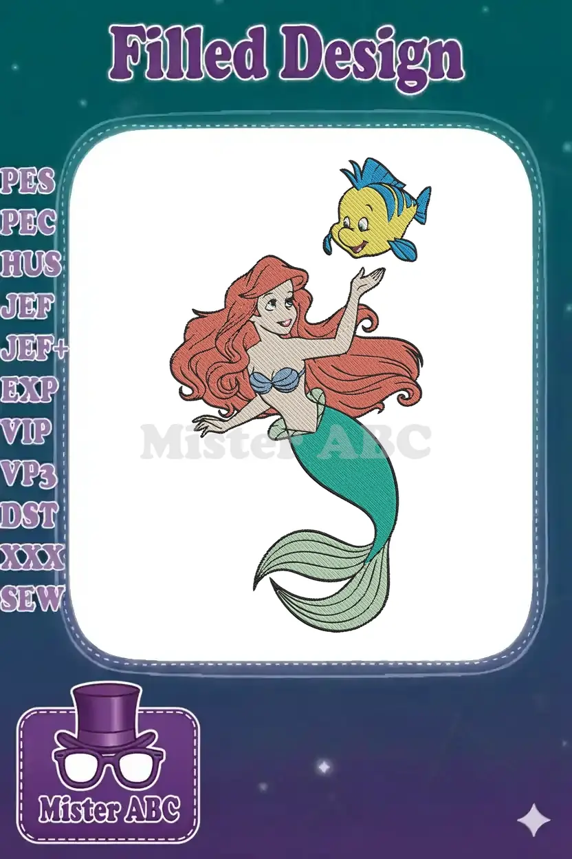 Dive into an enchanting underwater world with this vibrant embroidery featuring Ariel and Flounder. Perfect for Disney fans!