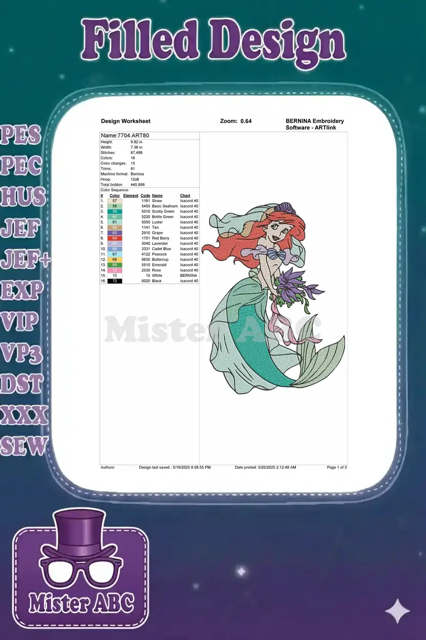Embrace enchantment with this exquisite embroidery design featuring Ariel as a beautiful bride, holding a vibrant bouquet. Perfect for adding a magical touch to any project.