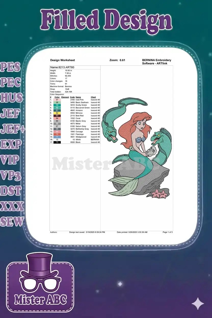 Ariel mermaid princess with Flotsam and Jetsam eels embroidery designs