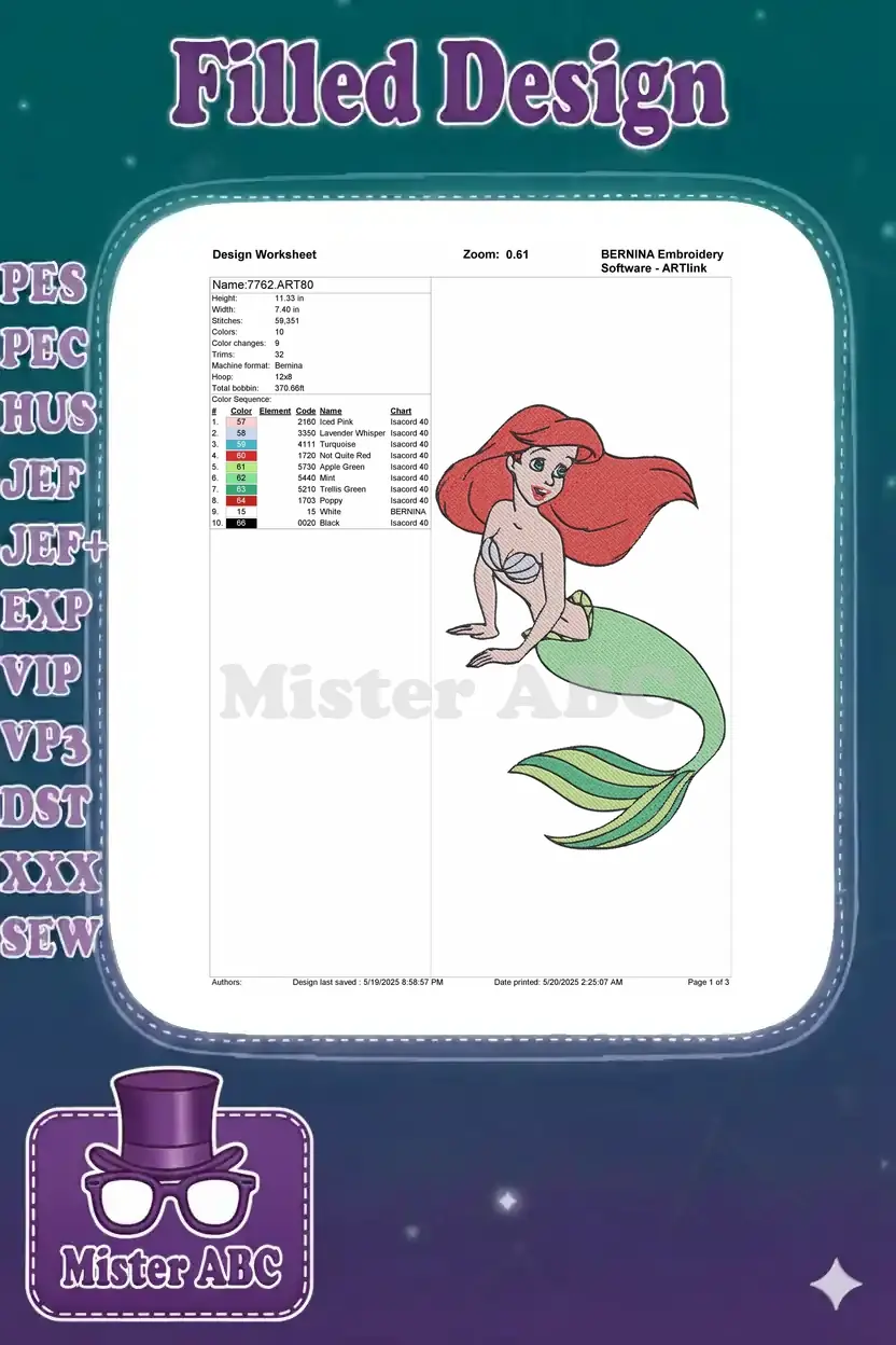 Ariel mermaid princess red hair green tail embroidery designs