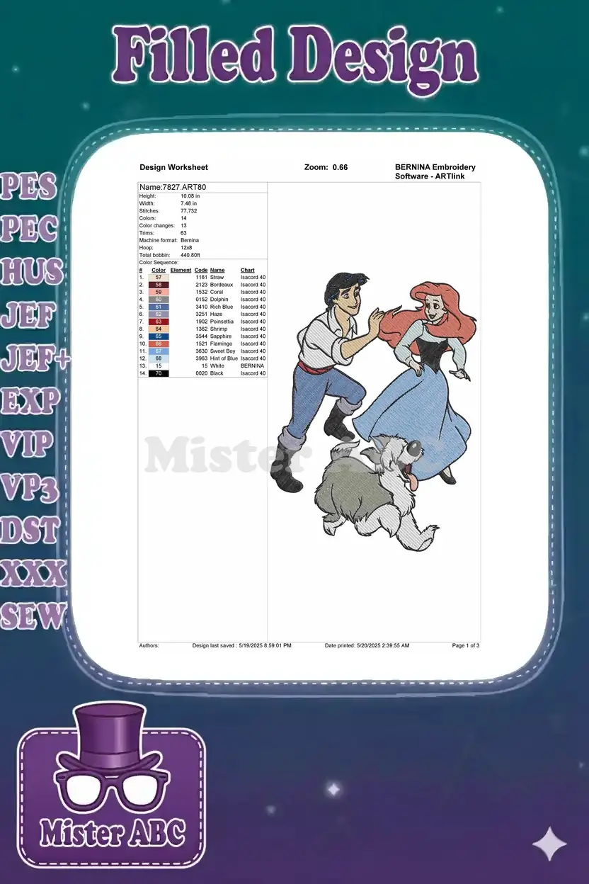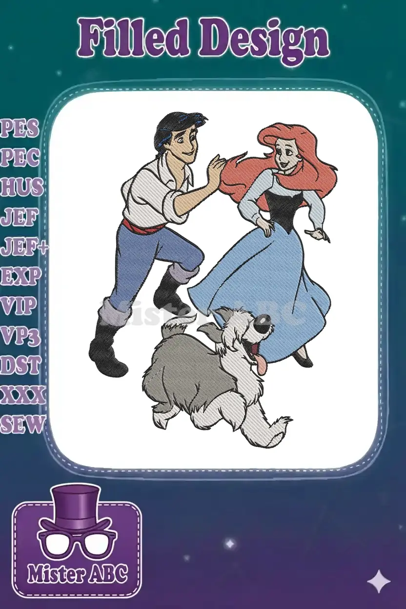 Dive into adventure with this vibrant embroidery design featuring Ariel, Prince Eric, and Max dancing joyfully. Perfect for fans of classic tales, adding a touch of magic to any project with intricate fill stitches.