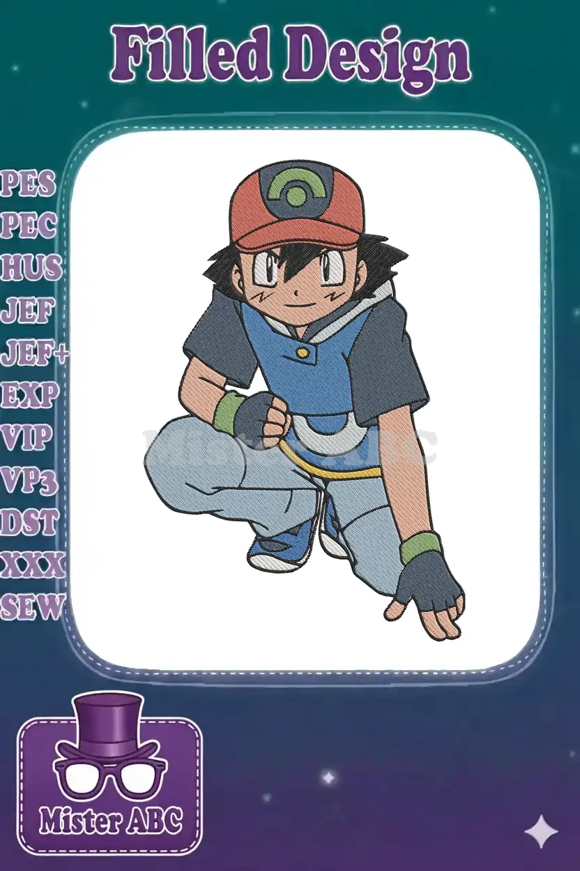 Ash Ketchum Pokémon Trainer Crouching Adventure Embroidery Designs for Fans