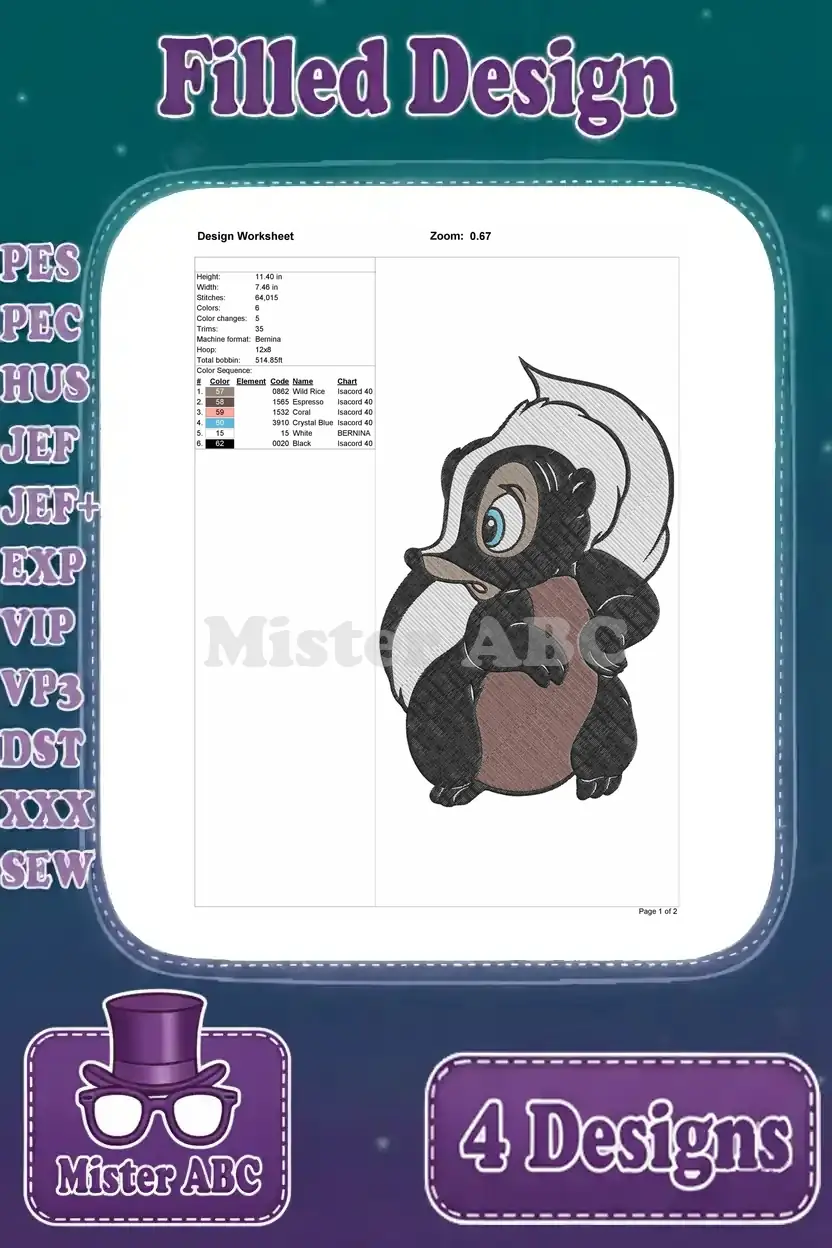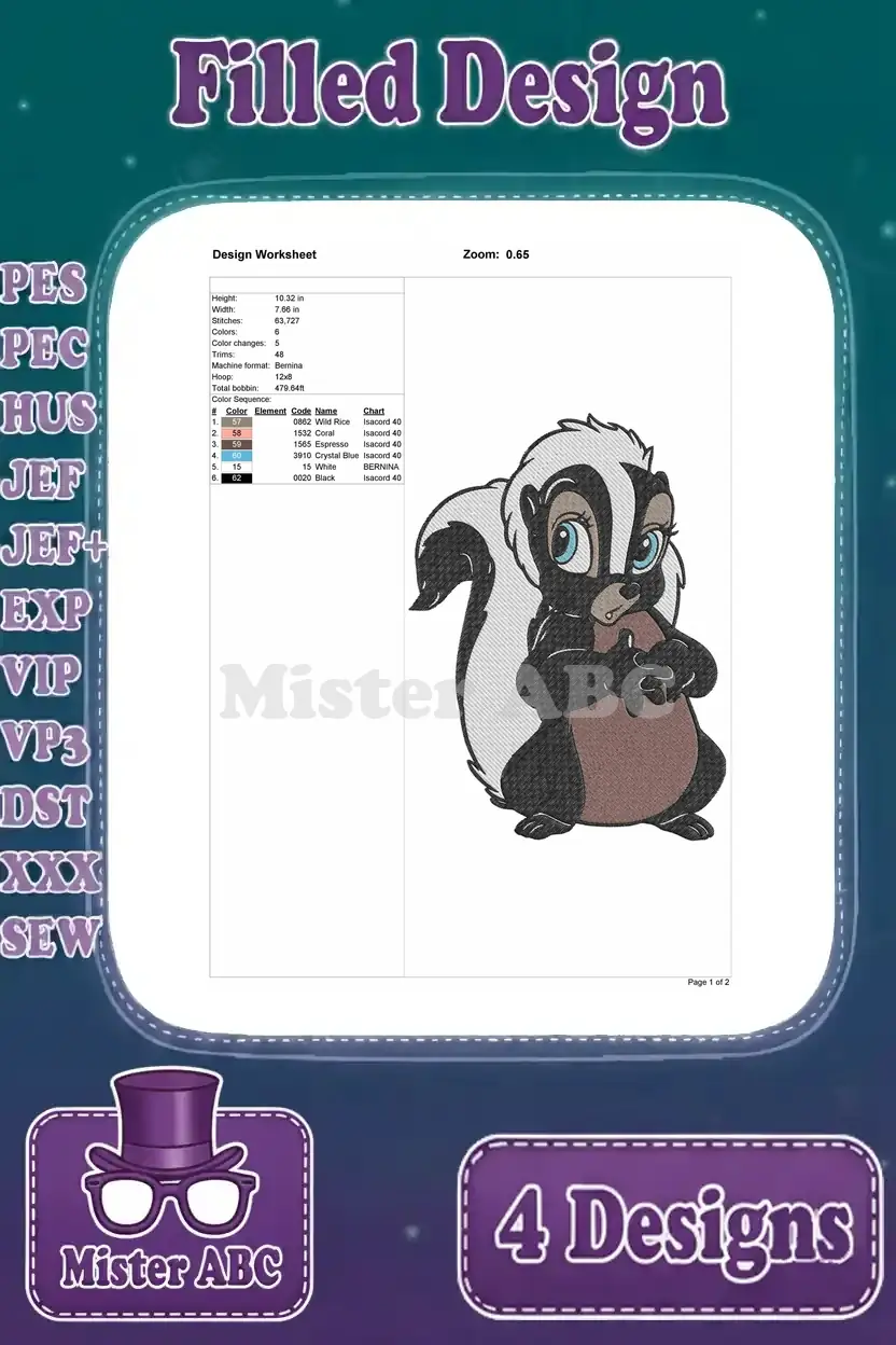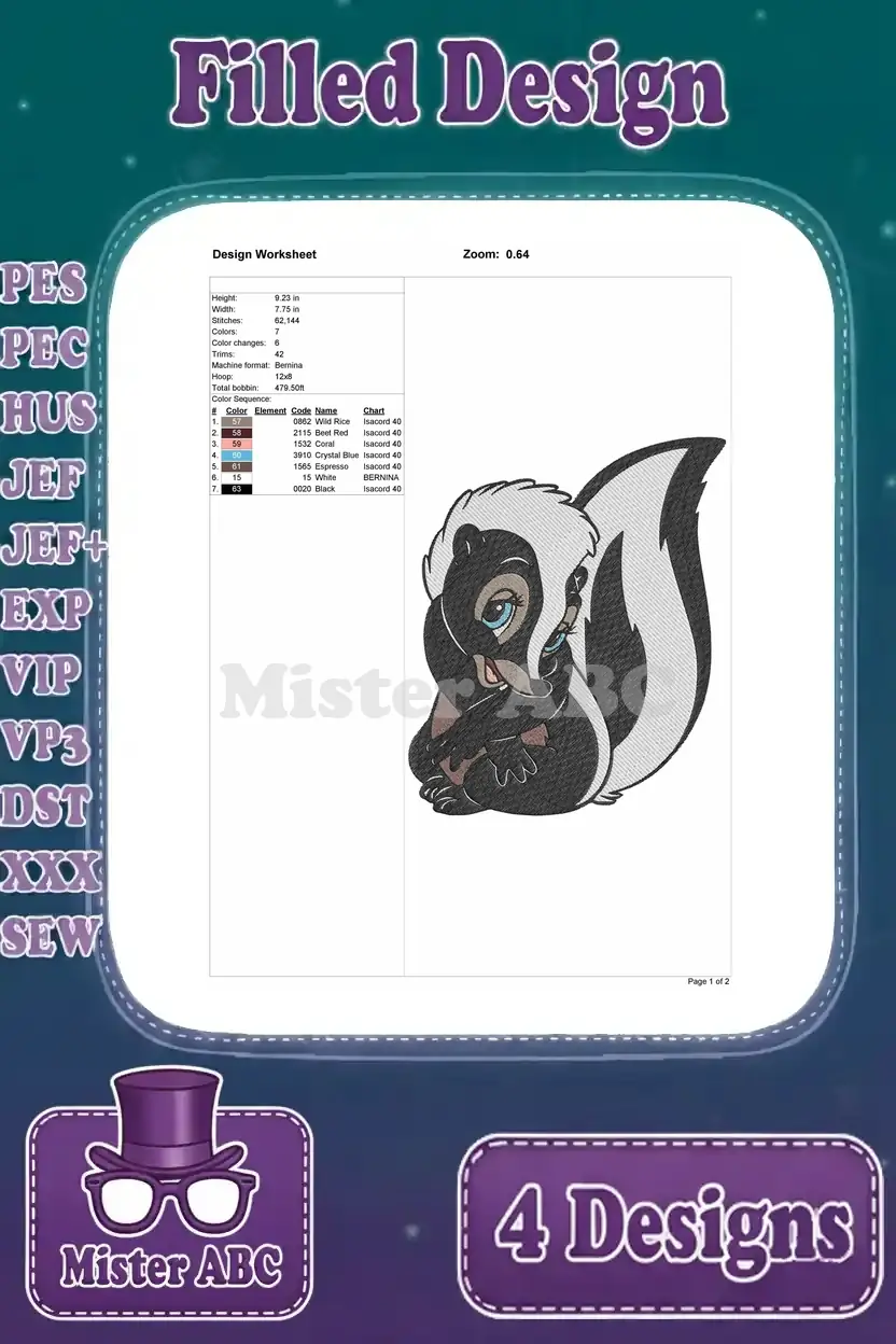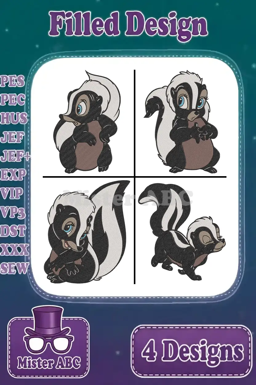 Bambi Flower The Shy Skunk Various Cute Expressions And Standing Poses Set – Filled Embroidery Design