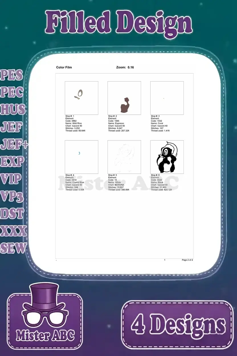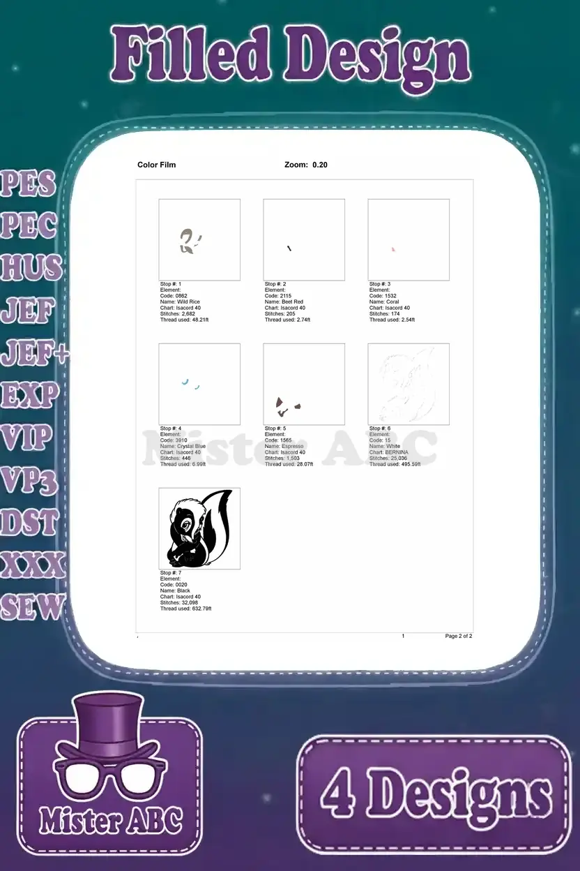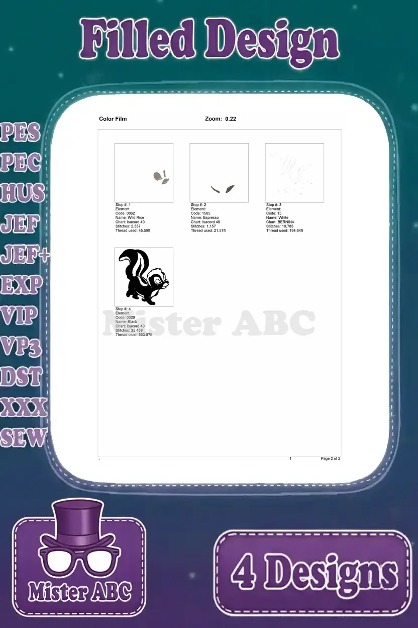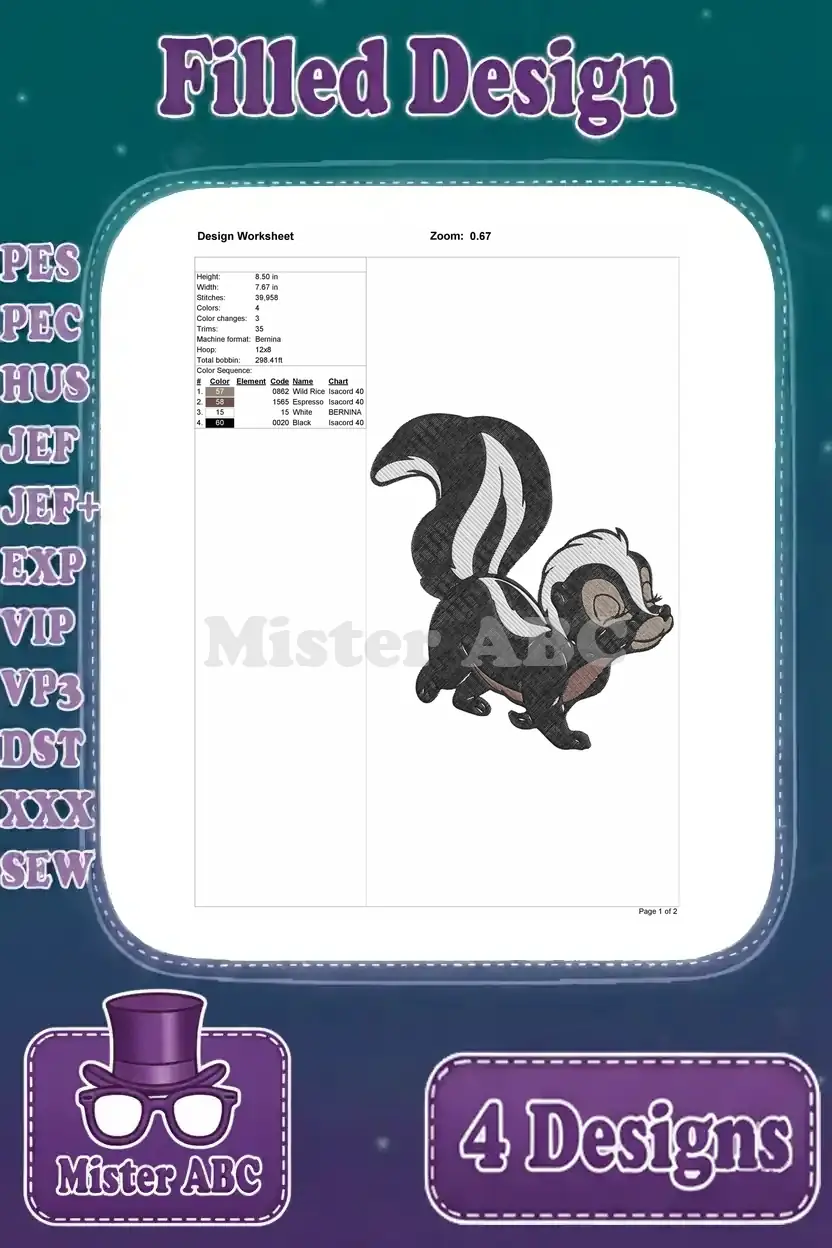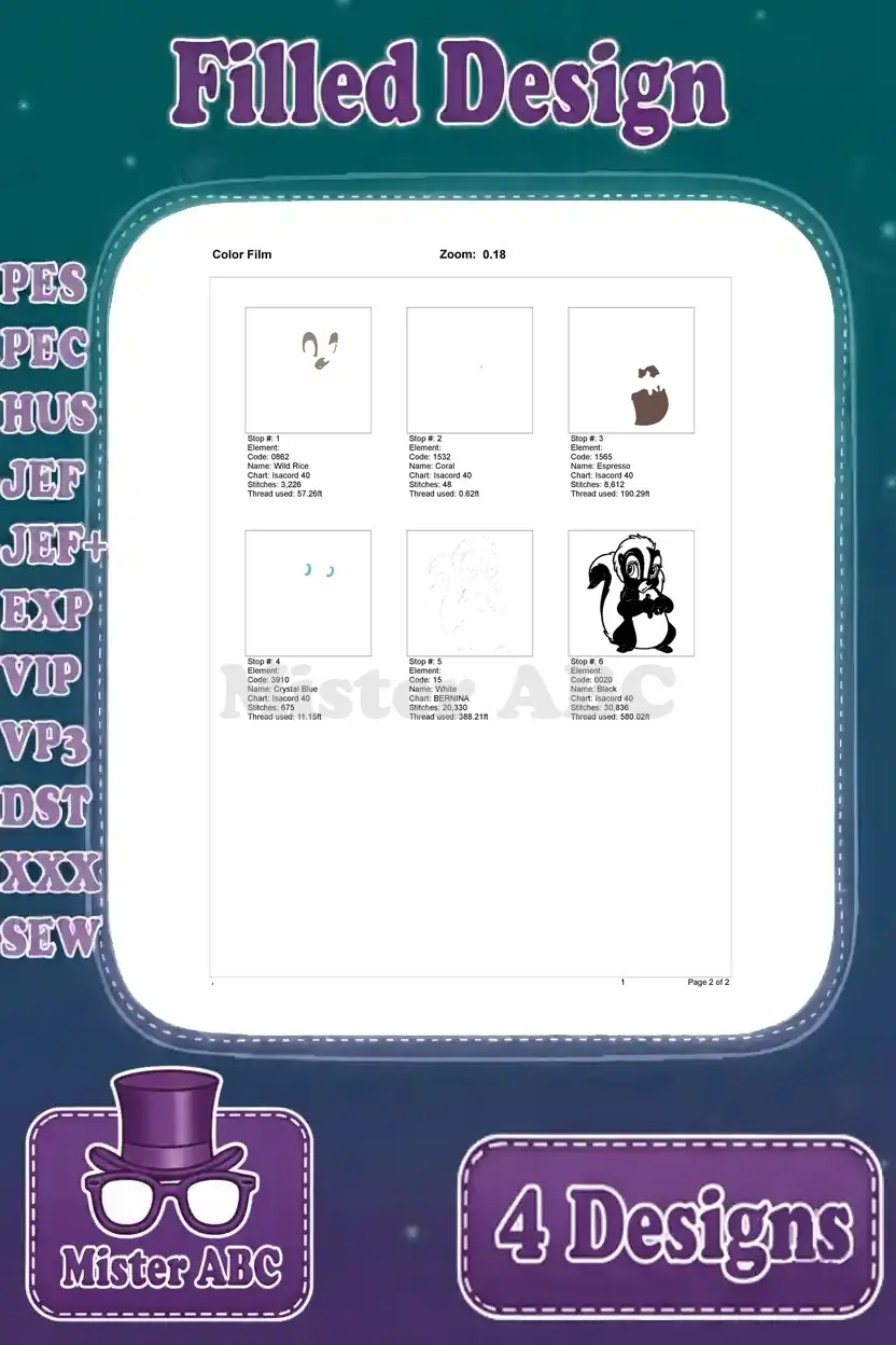 Bambi Flower The Shy Skunk Various Cute Expressions And Standing Poses Set – Filled Embroidery Design