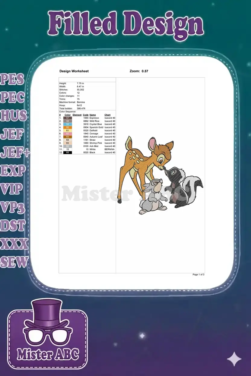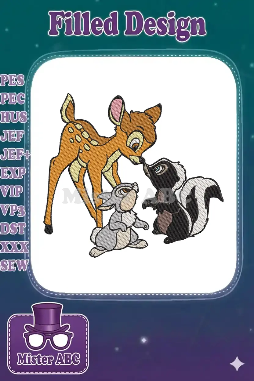 Capture the magic of Disney with this adorable embroidery design featuring Bambi, Thumper, and Flower. Perfect for adding a touch of classic charm to any project. A delightful trio for fans of all ages!