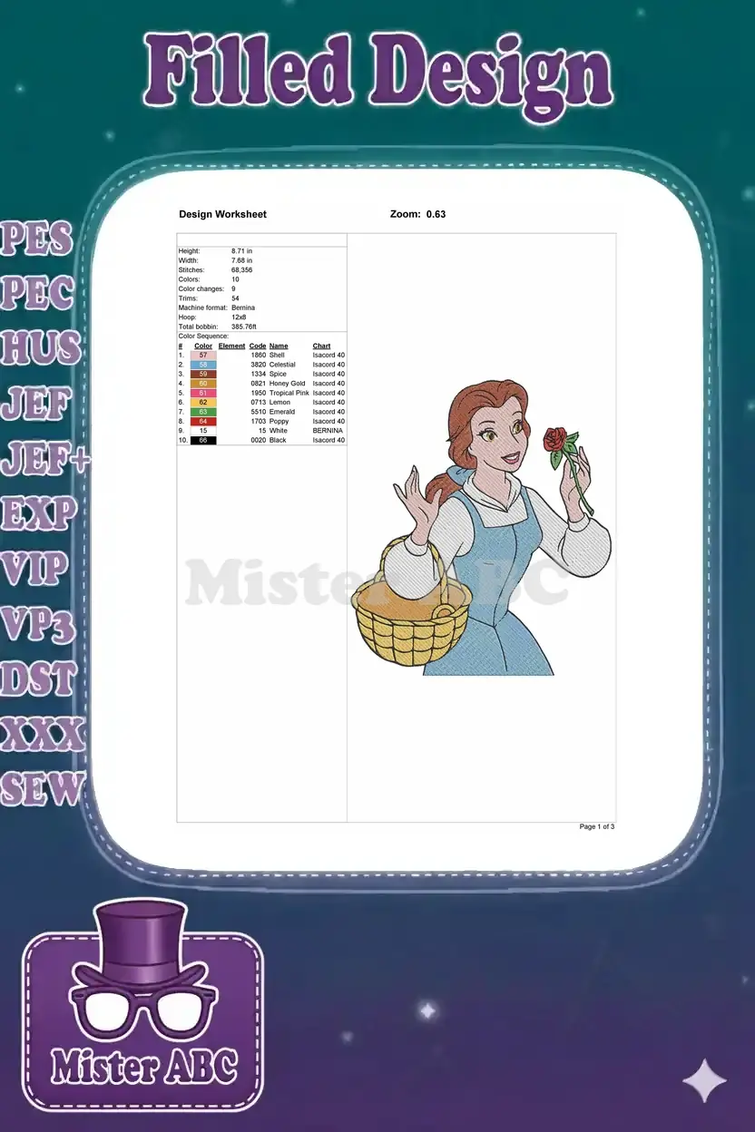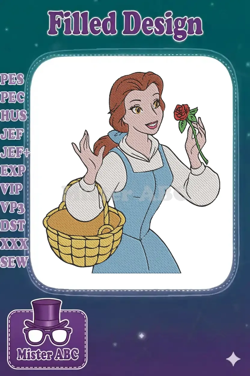 An enchanting embroidery design featuring Princess Belle, holding a delicate rose and a charming basket. Perfect for adding a touch of fairy tale magic to any project, capturing her iconic grace.