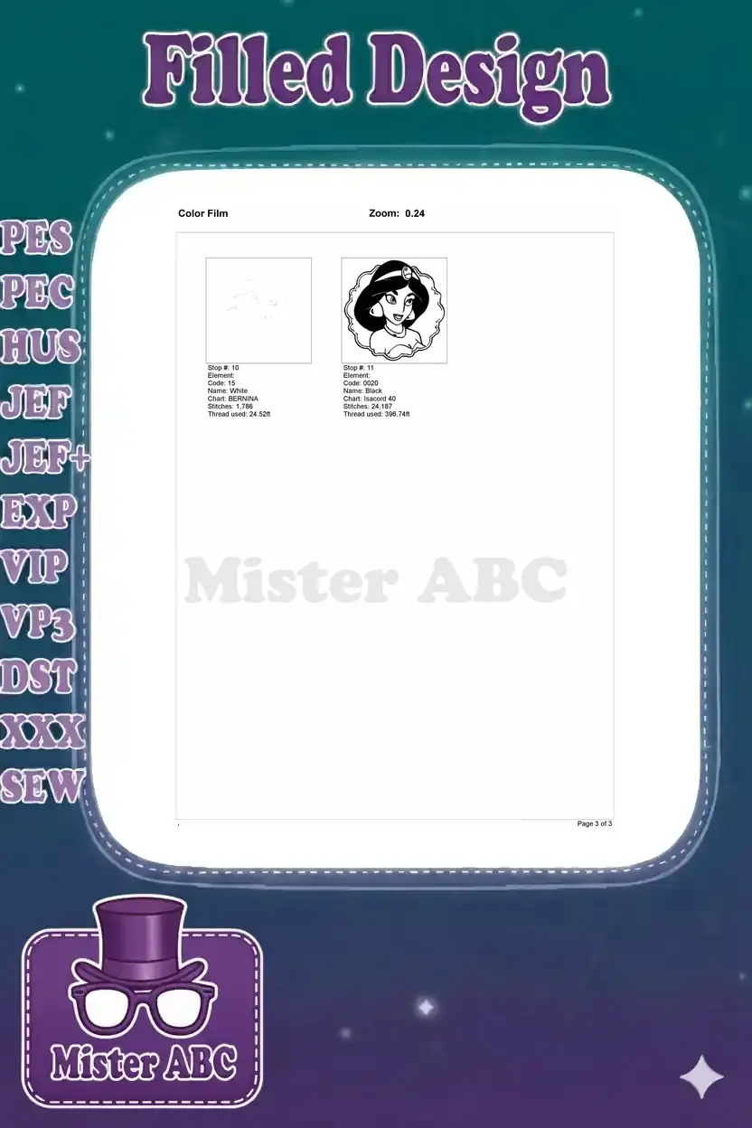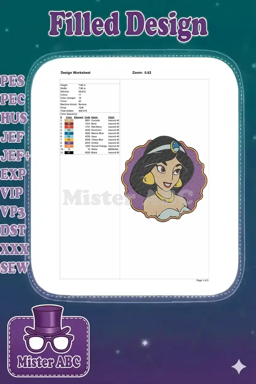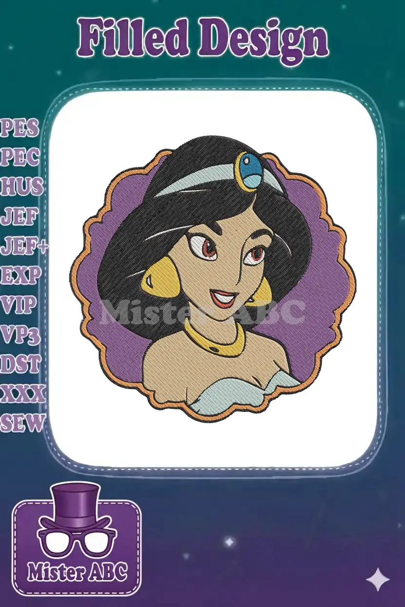 Beautiful Disney Princess Jasmine portrait embroidery designs for regal projects