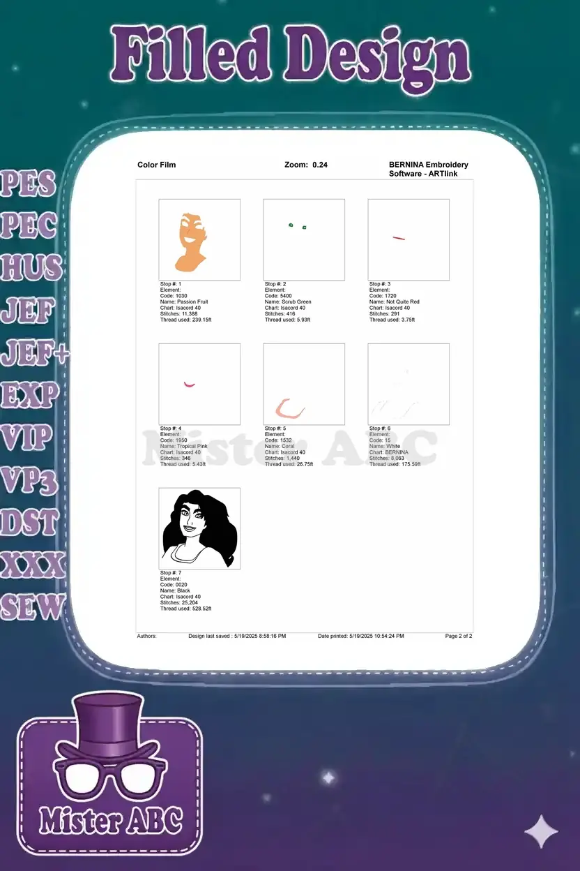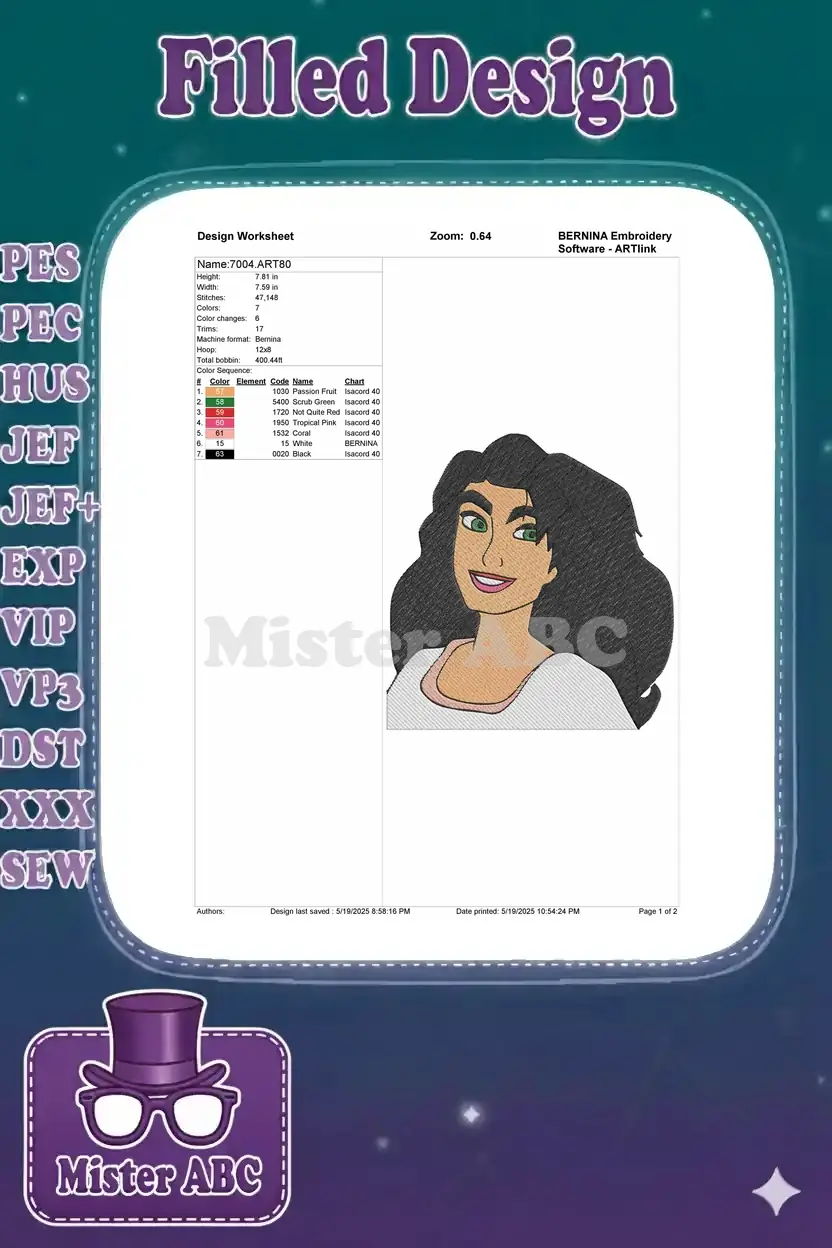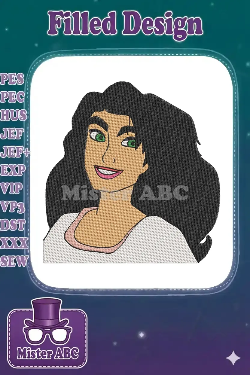 Beautiful Esmeralda inspired cartoon woman green eyes embroidery designs