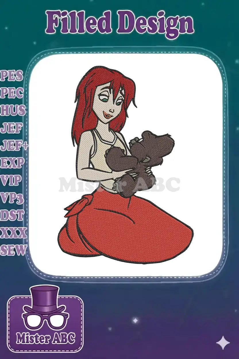 Charming embroidery design featuring Jane Porter cradling a baby gorilla, capturing a tender moment of jungle affection. Perfect for fans!
