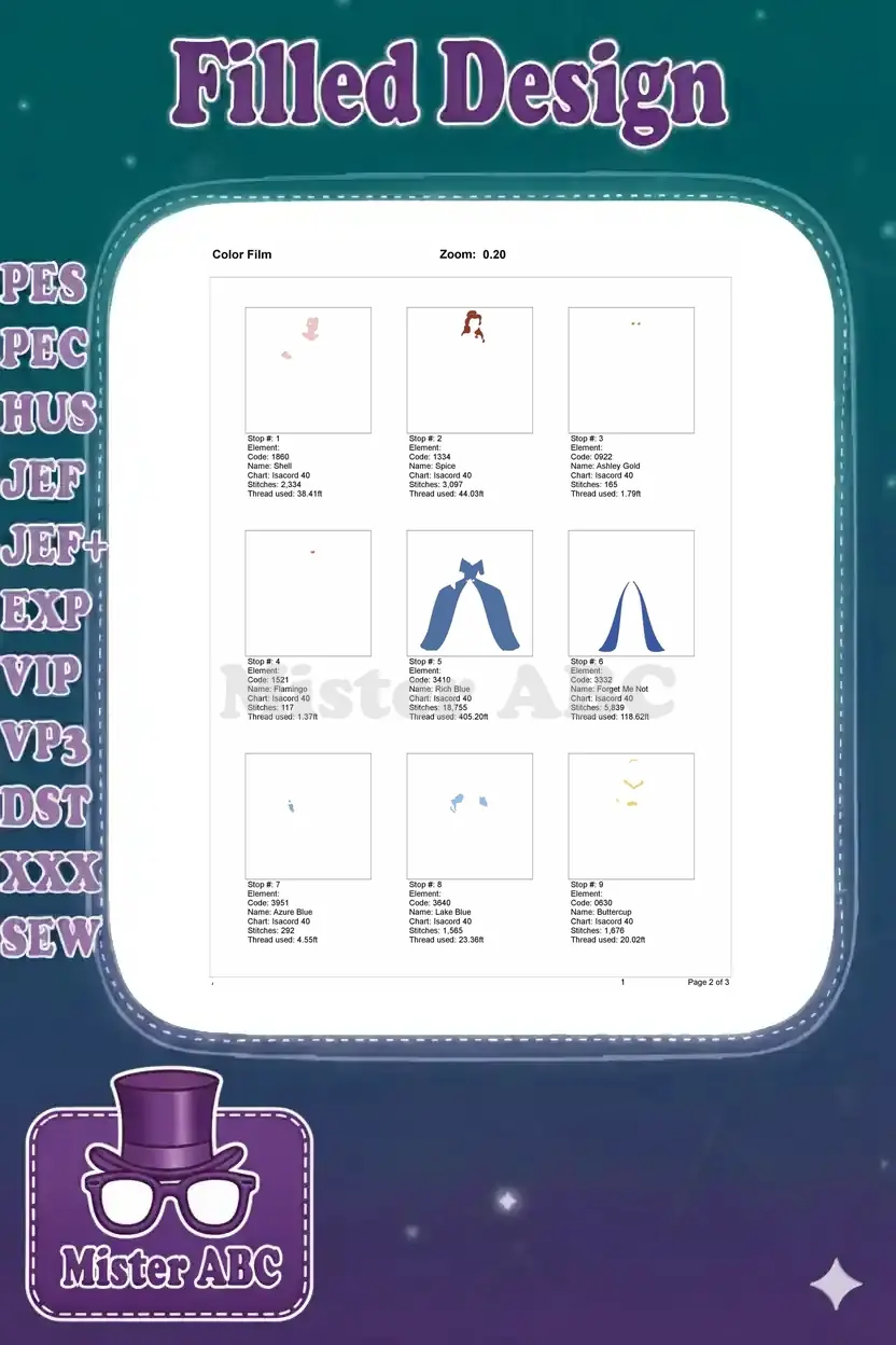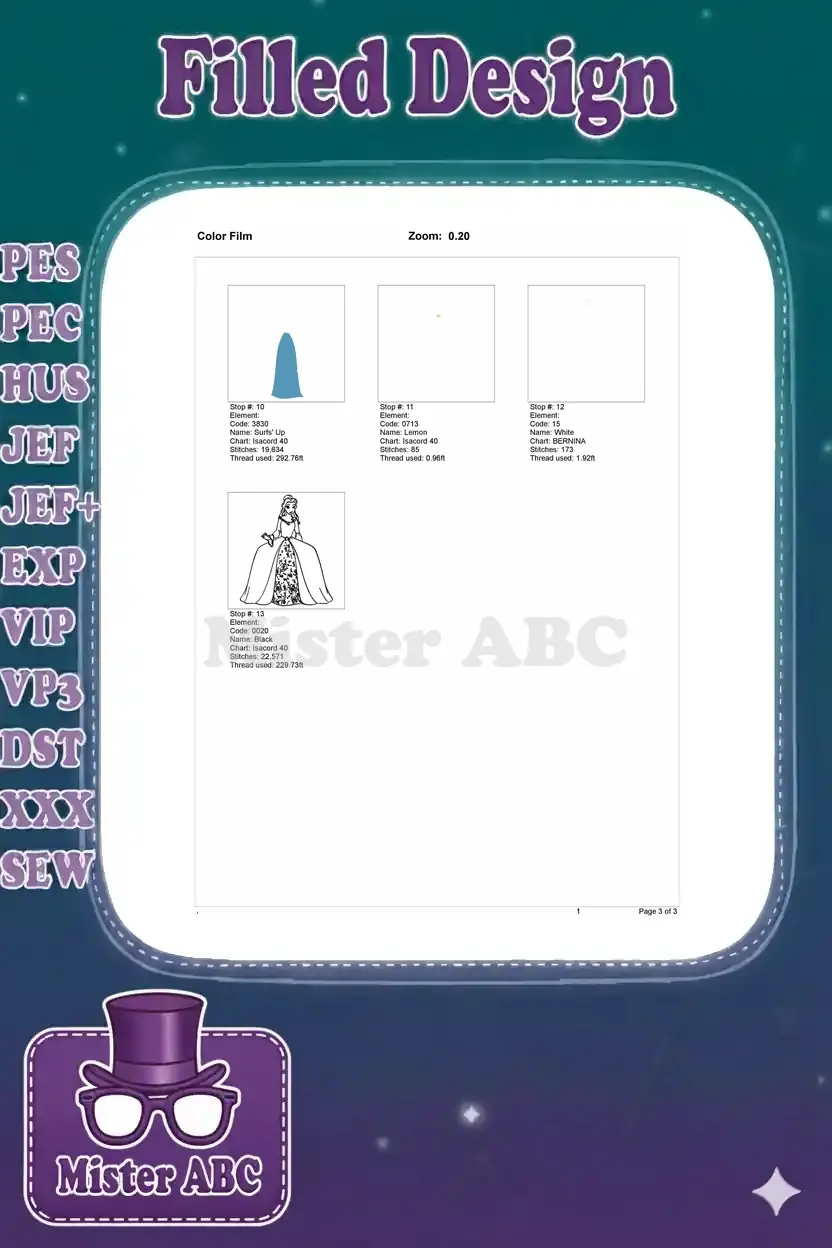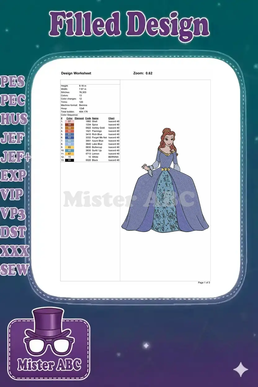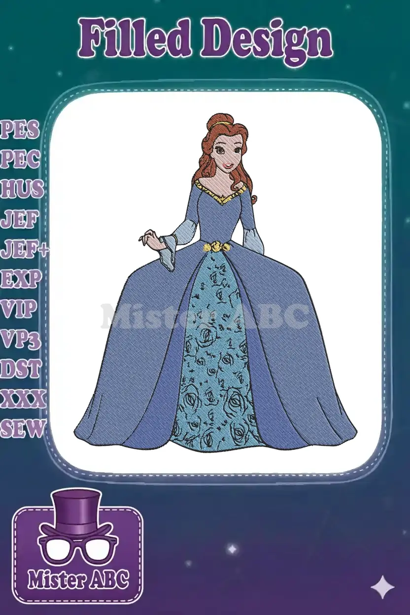 Elegant Belle embroidery design in a stunning blue ball gown, perfect for adding a touch of fairytale magic to any project.