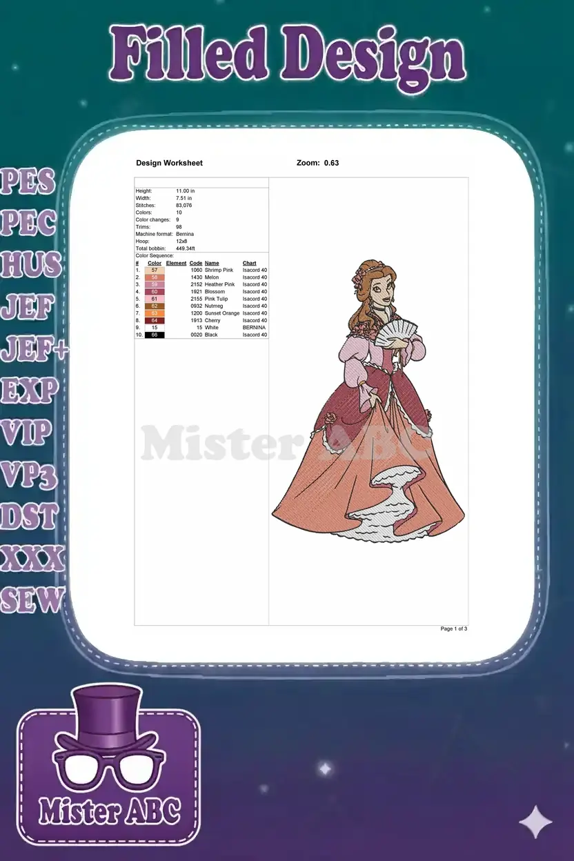Beautiful Princess Belle with Fan Historical Gown Embroidery Designs