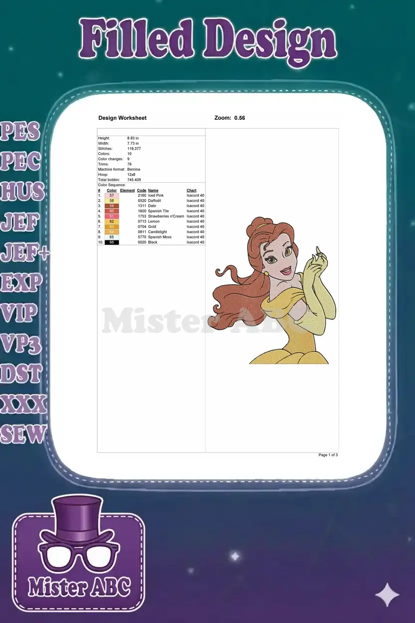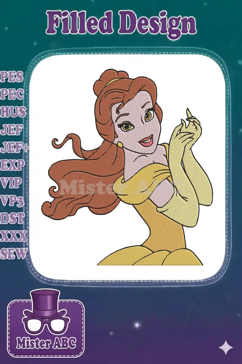 Beautiful Princess Belle with Yellow Gown and Gloves embroidery designs