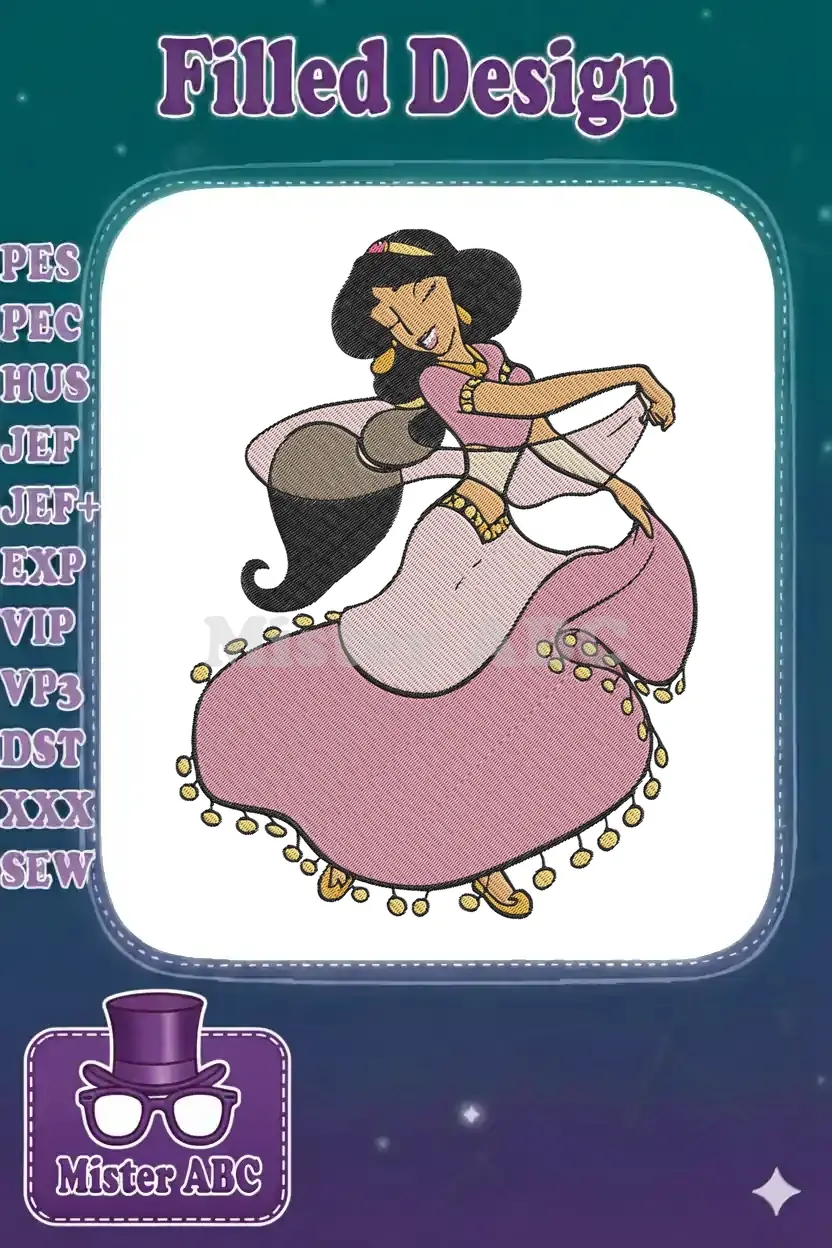 Captivating Princess Jasmine embroidery design, elegantly dancing in her signature pink attire, perfect for fans of classic Disney magic.