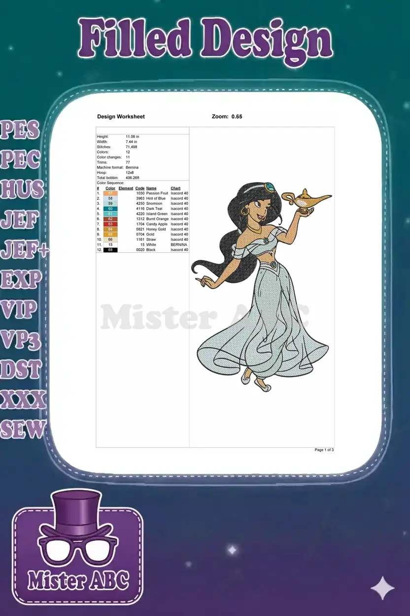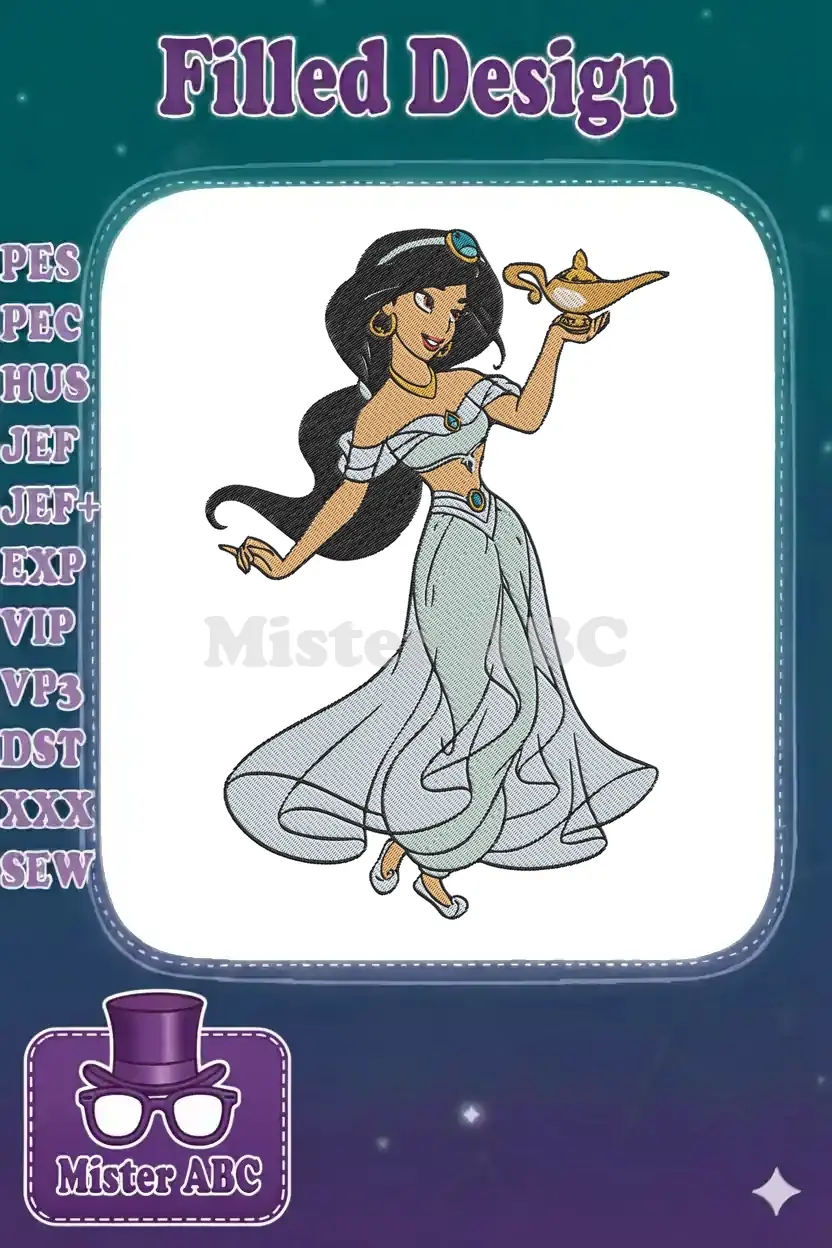 Beautiful Princess Jasmine holding golden magic lamp embroidery designs