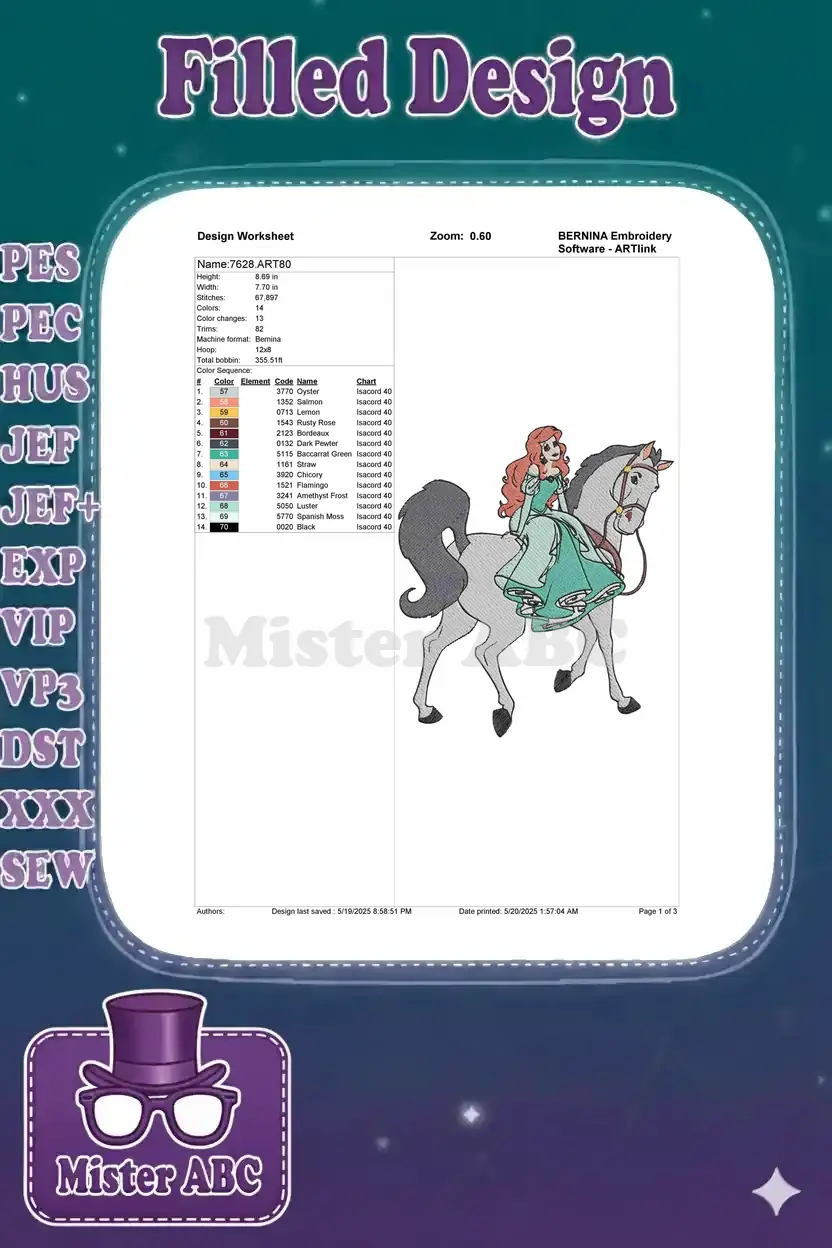 Beautiful Red-Haired Princess Ariel Riding Grey Horse Embroidery Designs