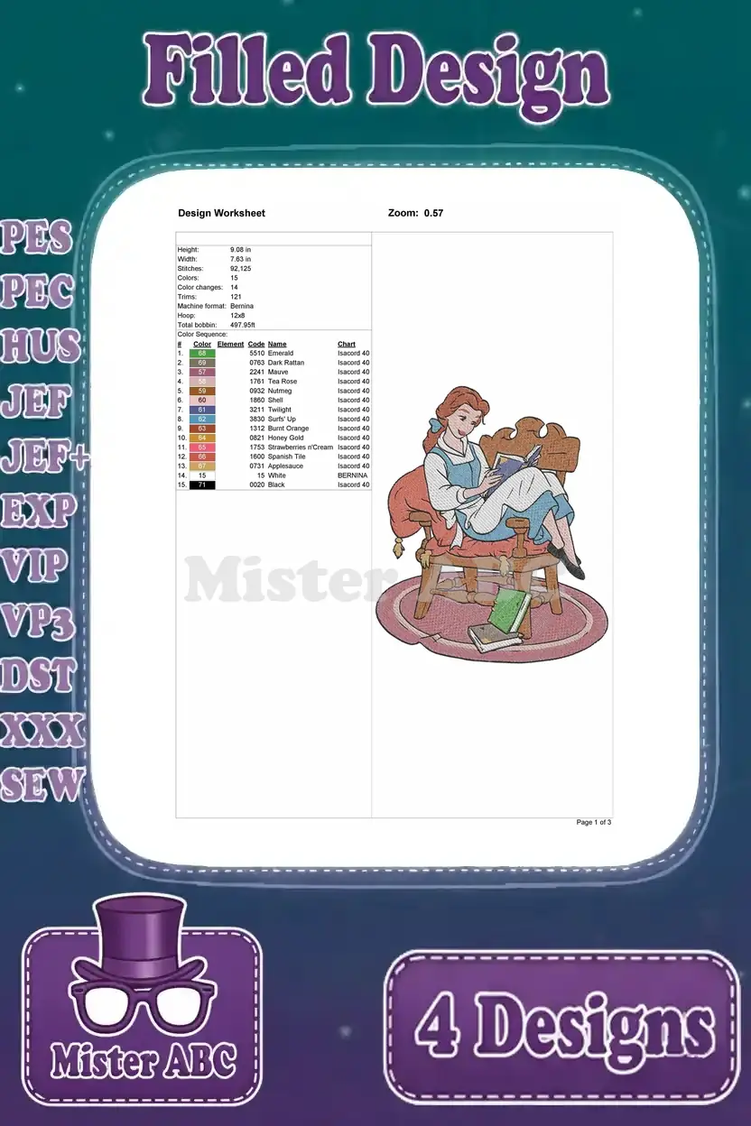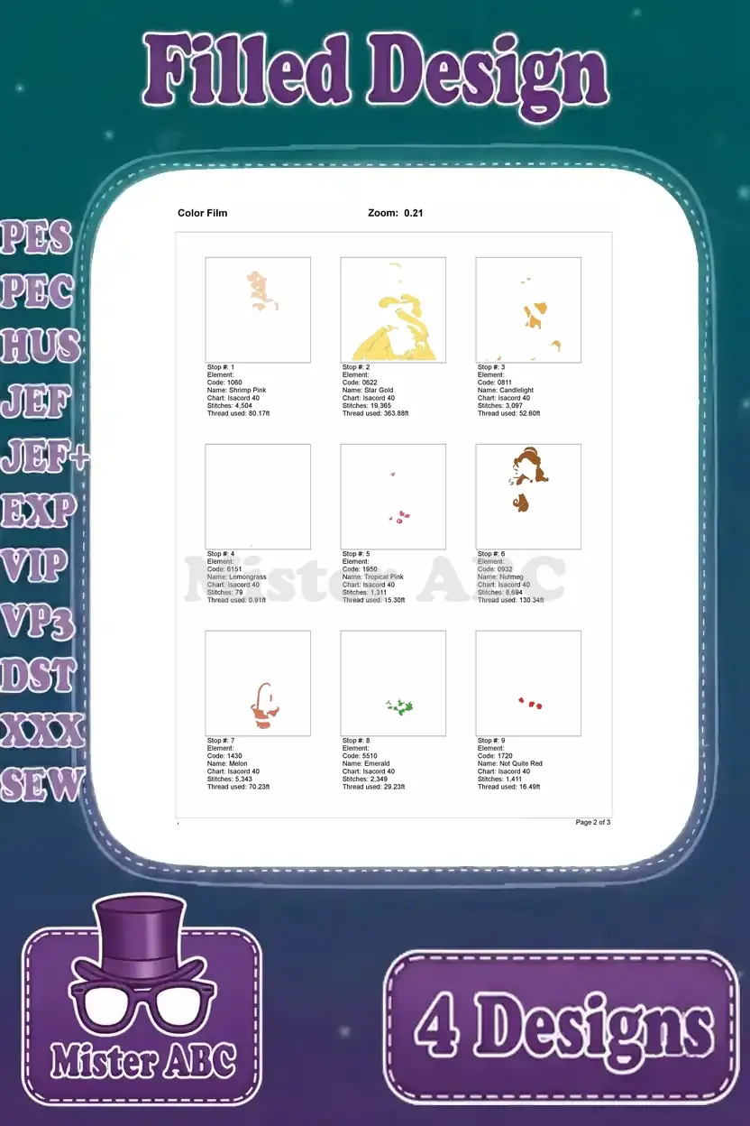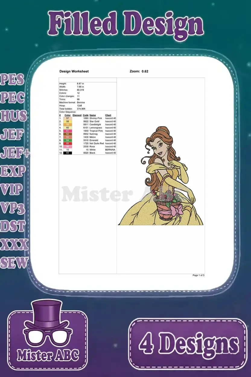 Beauty And The Beast Belle Blue Dress Portraits With Lumiere Yellow Ballgown Bust – Filled Embroidery Design