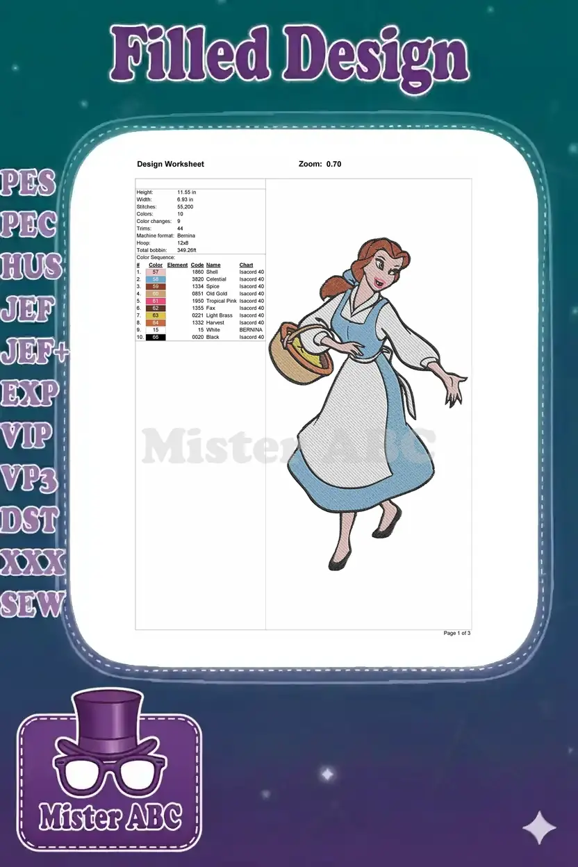 Bring the classic charm of Belle from Beauty and the Beast to life with this delightful embroidery design. Perfect for fans!