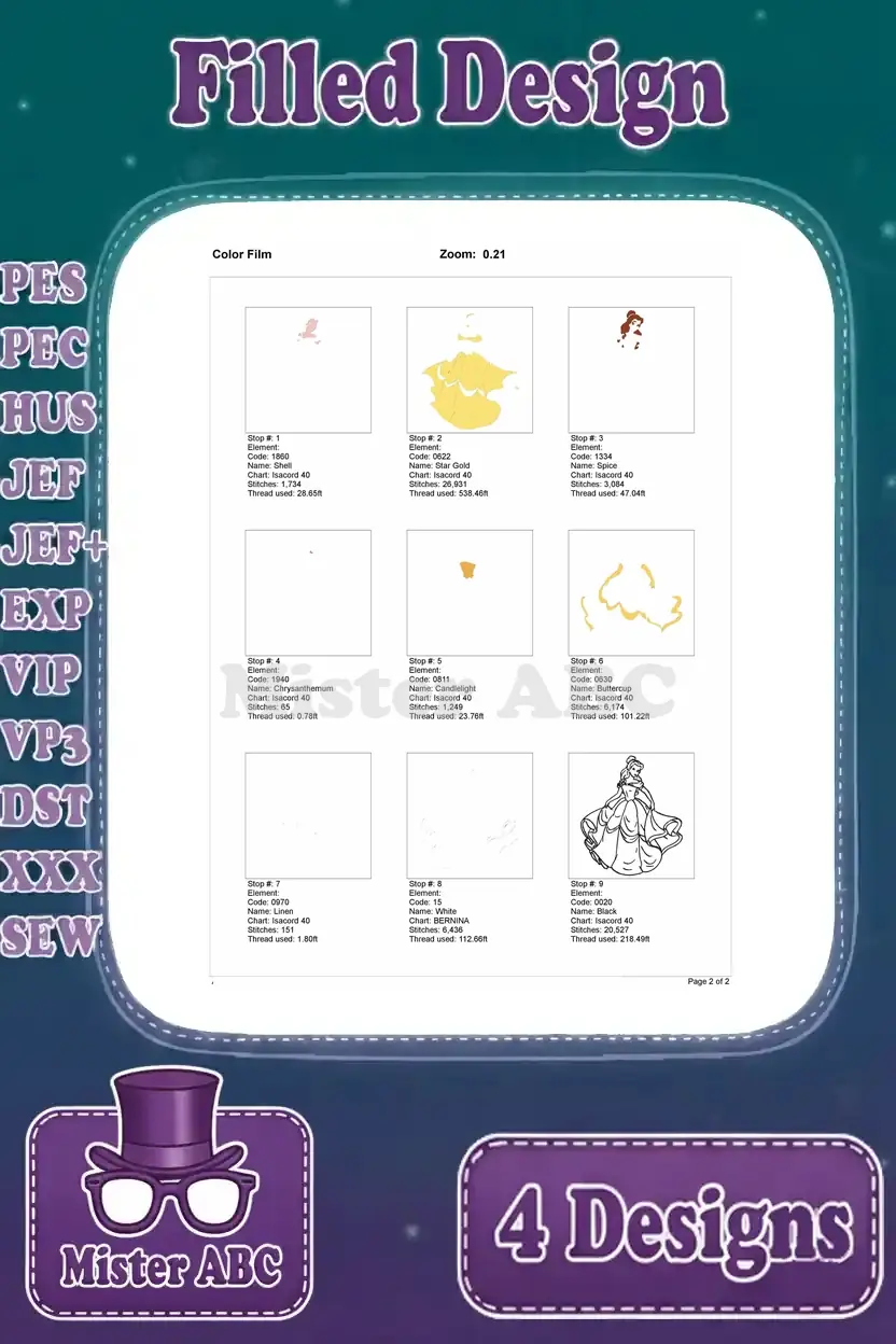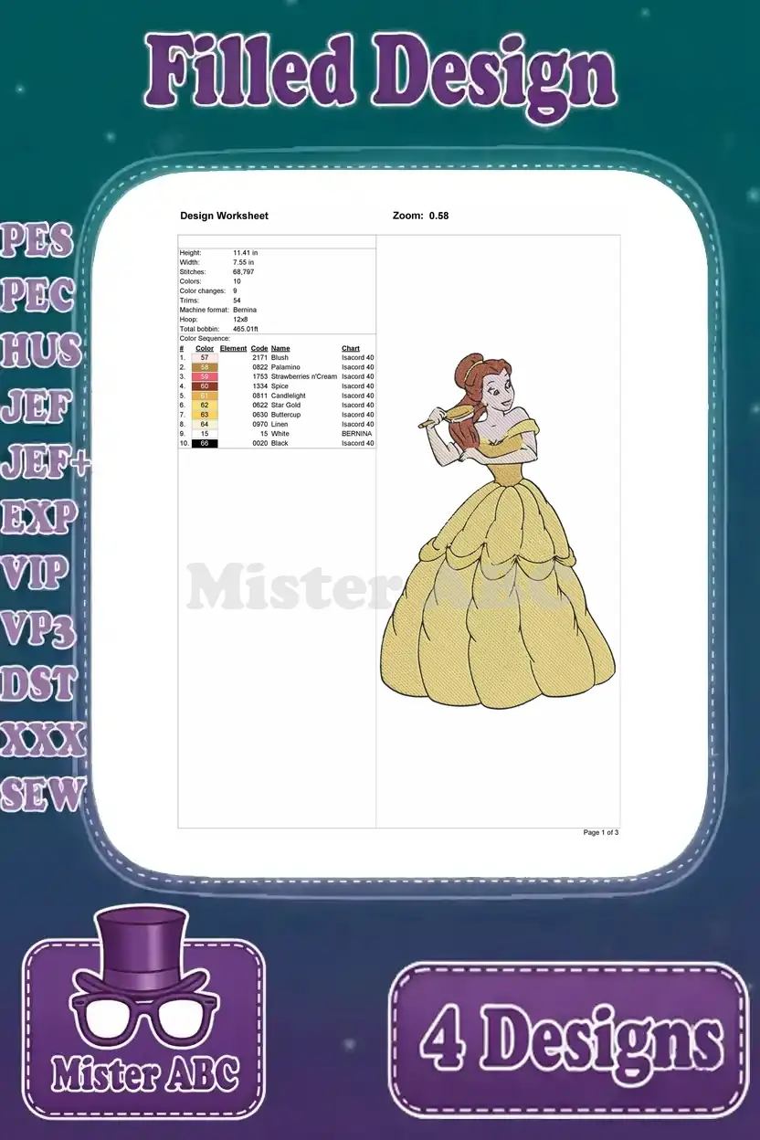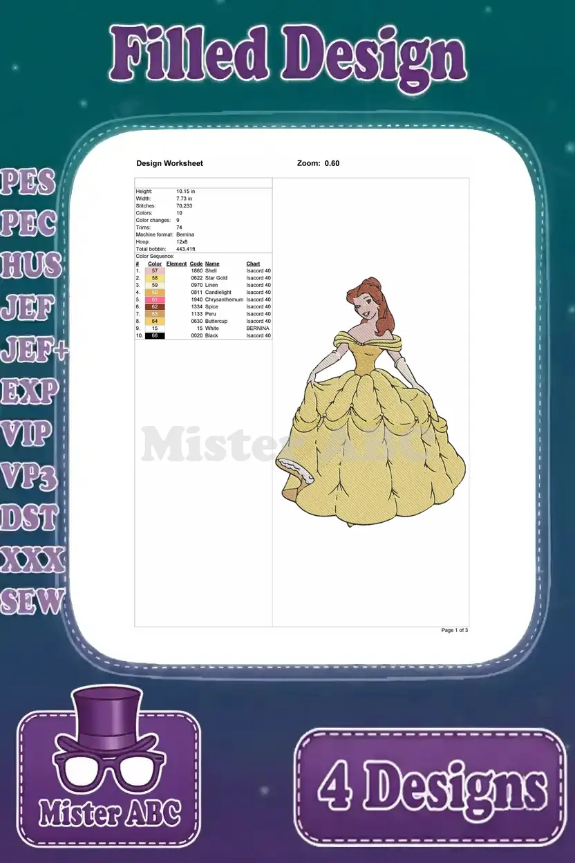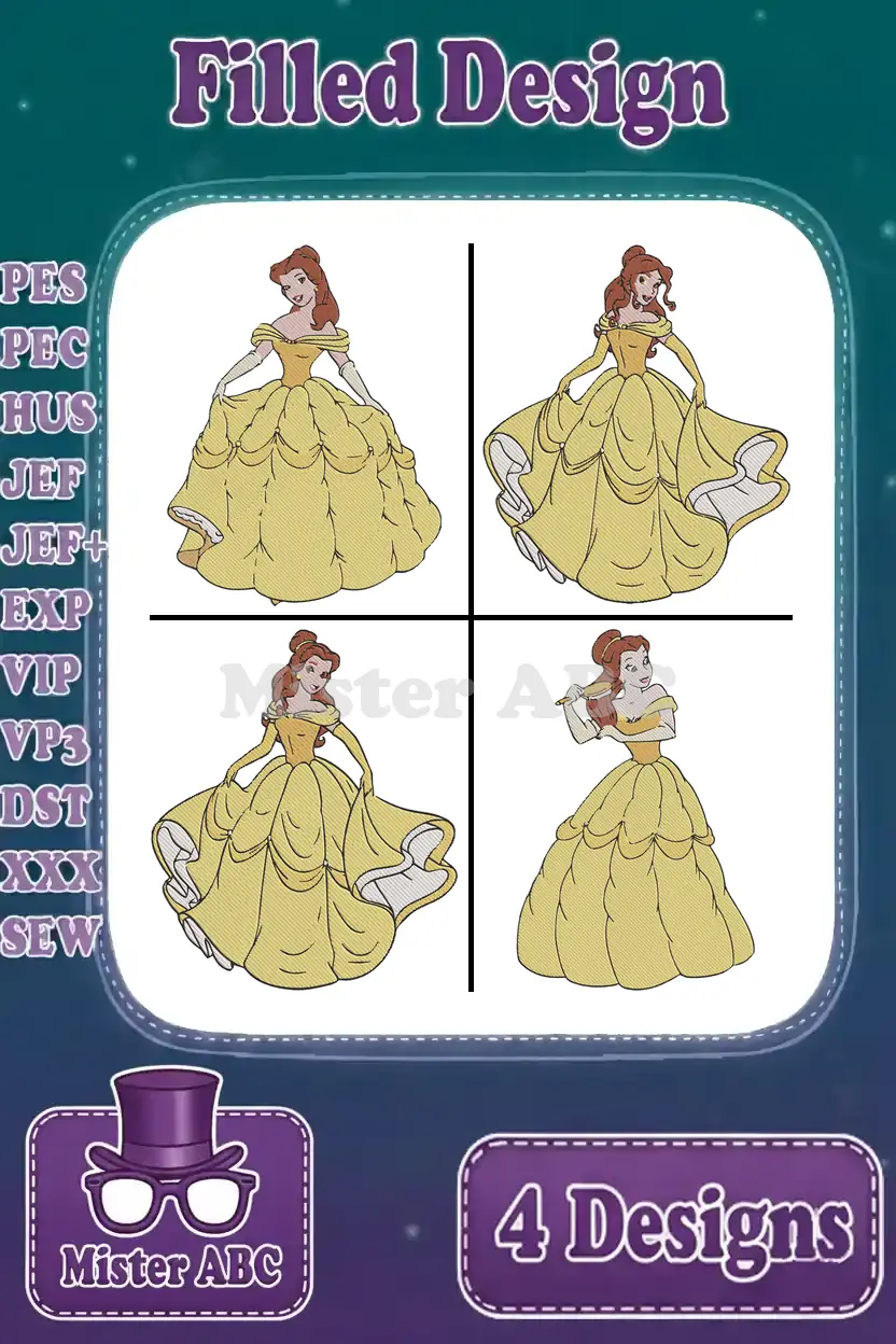 Beauty And The Beast Belle Classic Yellow Ballgown Assortment Of Elegant Poses – Filled Embroidery Design