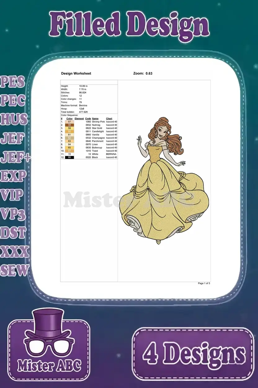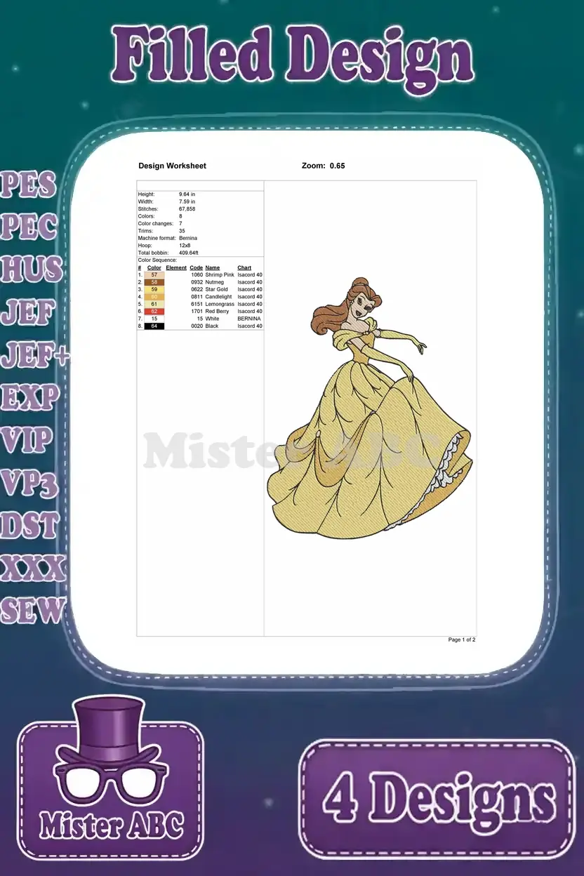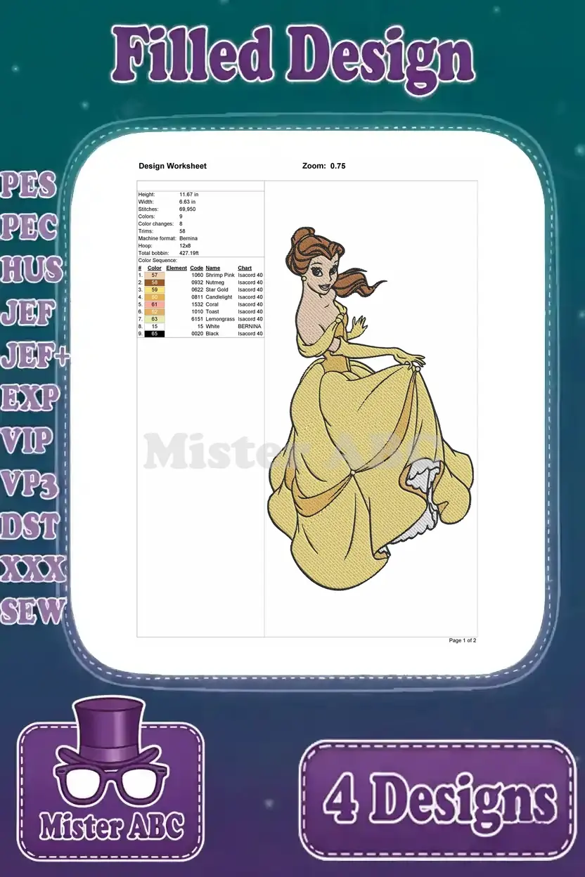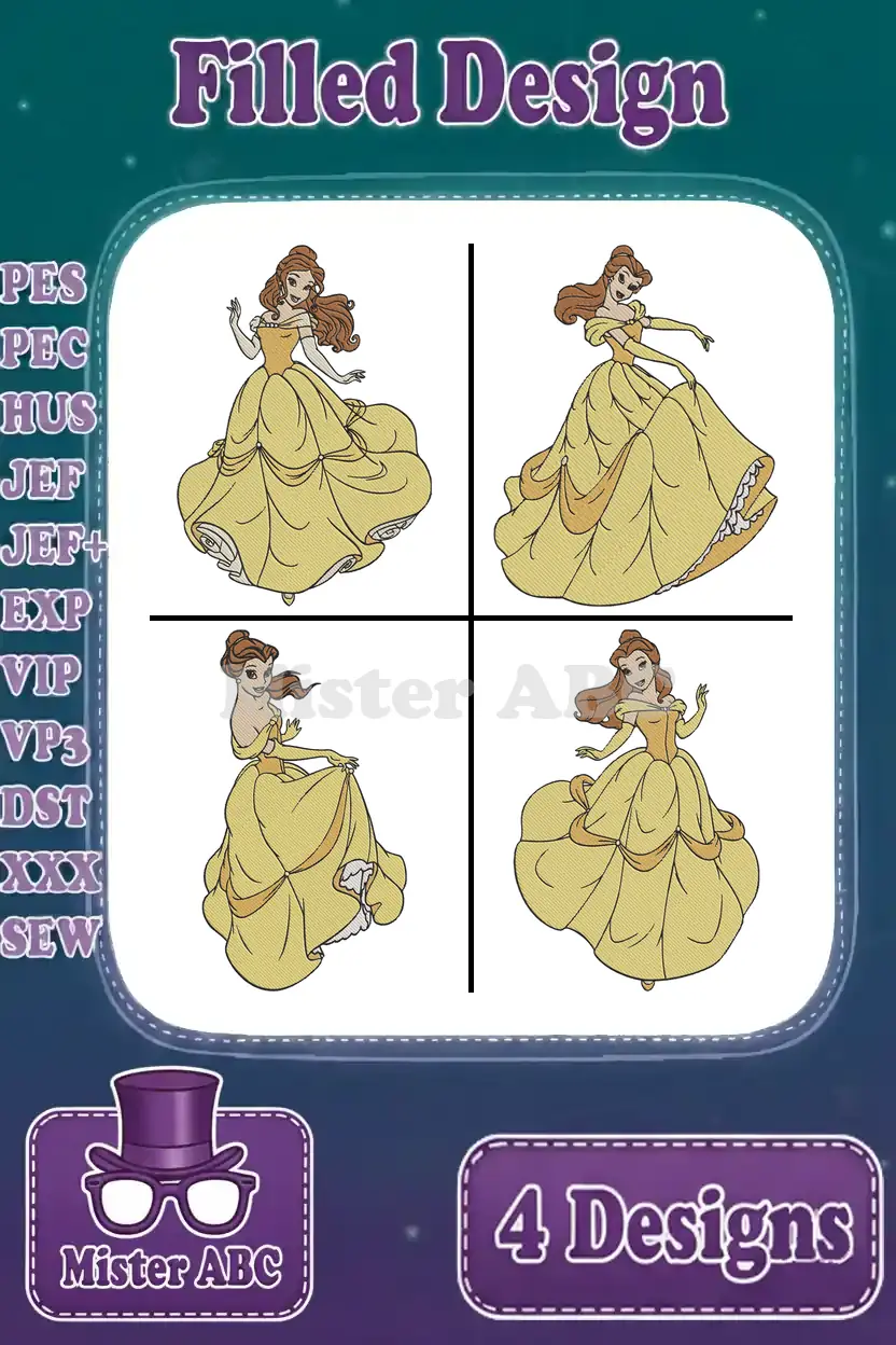 Beauty And The Beast Belle In Her Stunning Yellow Ballgown Various Graceful Poses – Filled Embroidery Design
