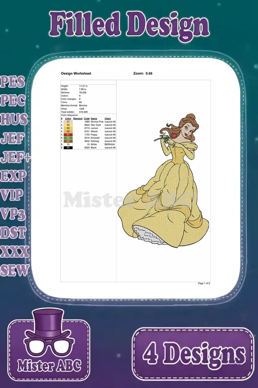 Beauty And The Beast Belle With Rose Enchanted Rose In Glass Yellow Ballgown – Filled Embroidery Design