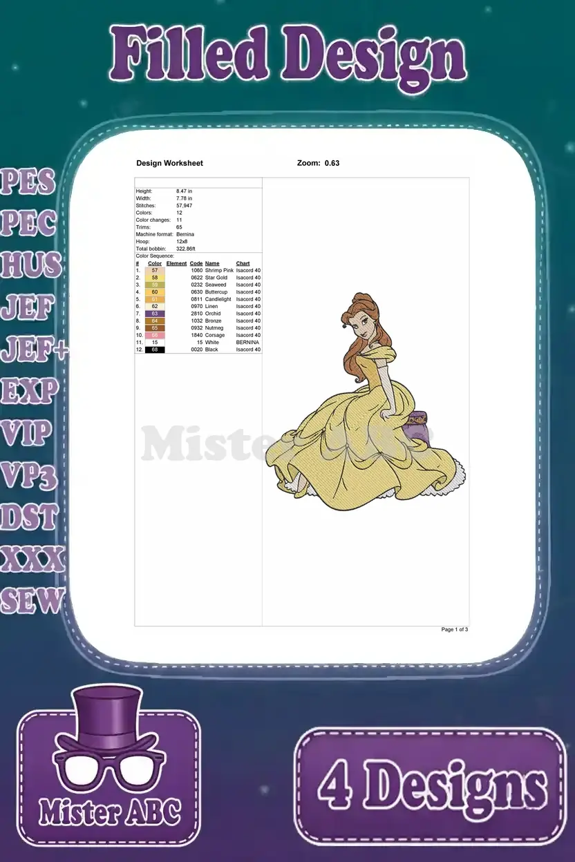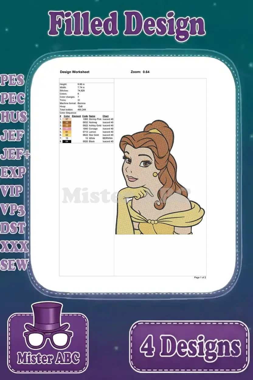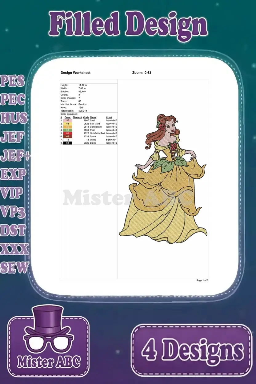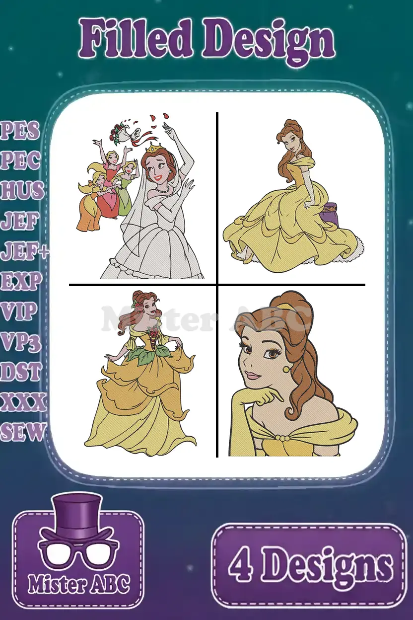 Beauty And The Beast Belle Wedding Dress Friends Yellow Ballgown Portrait – Filled Embroidery Design