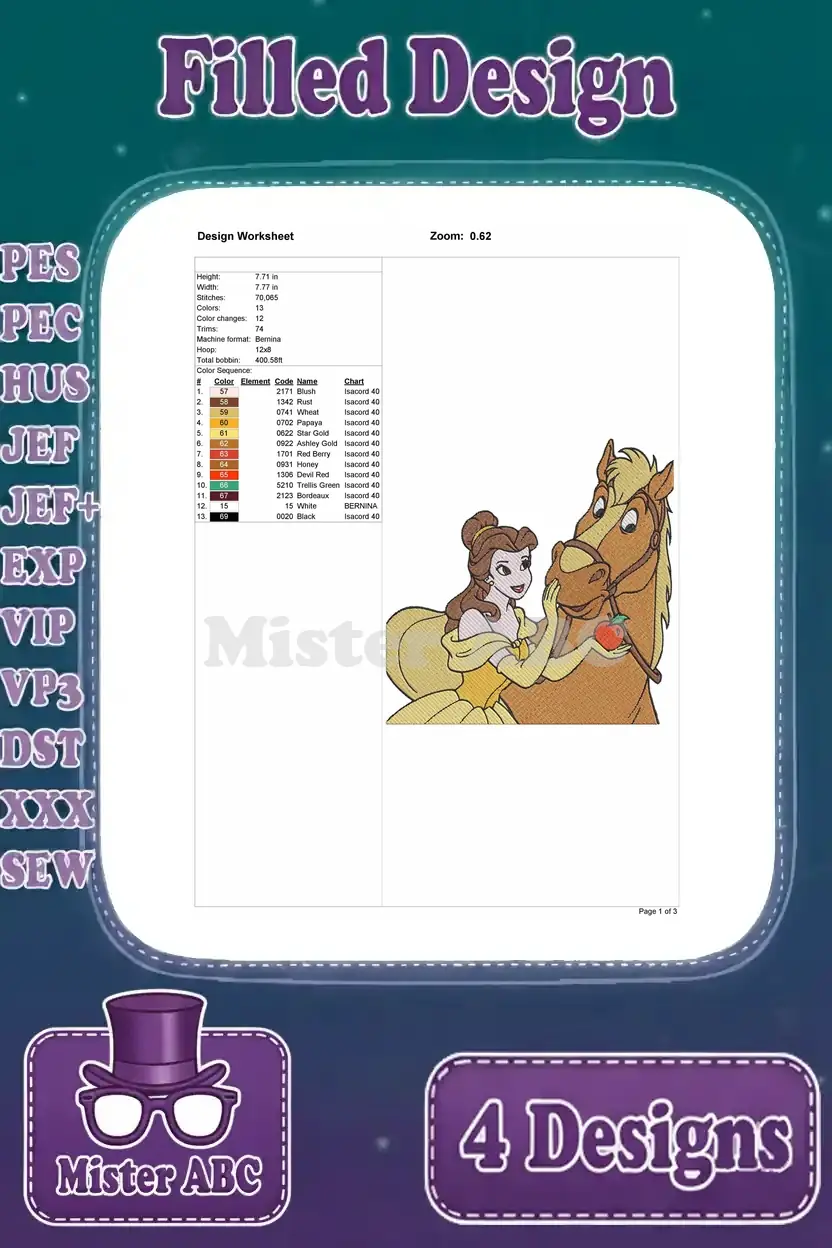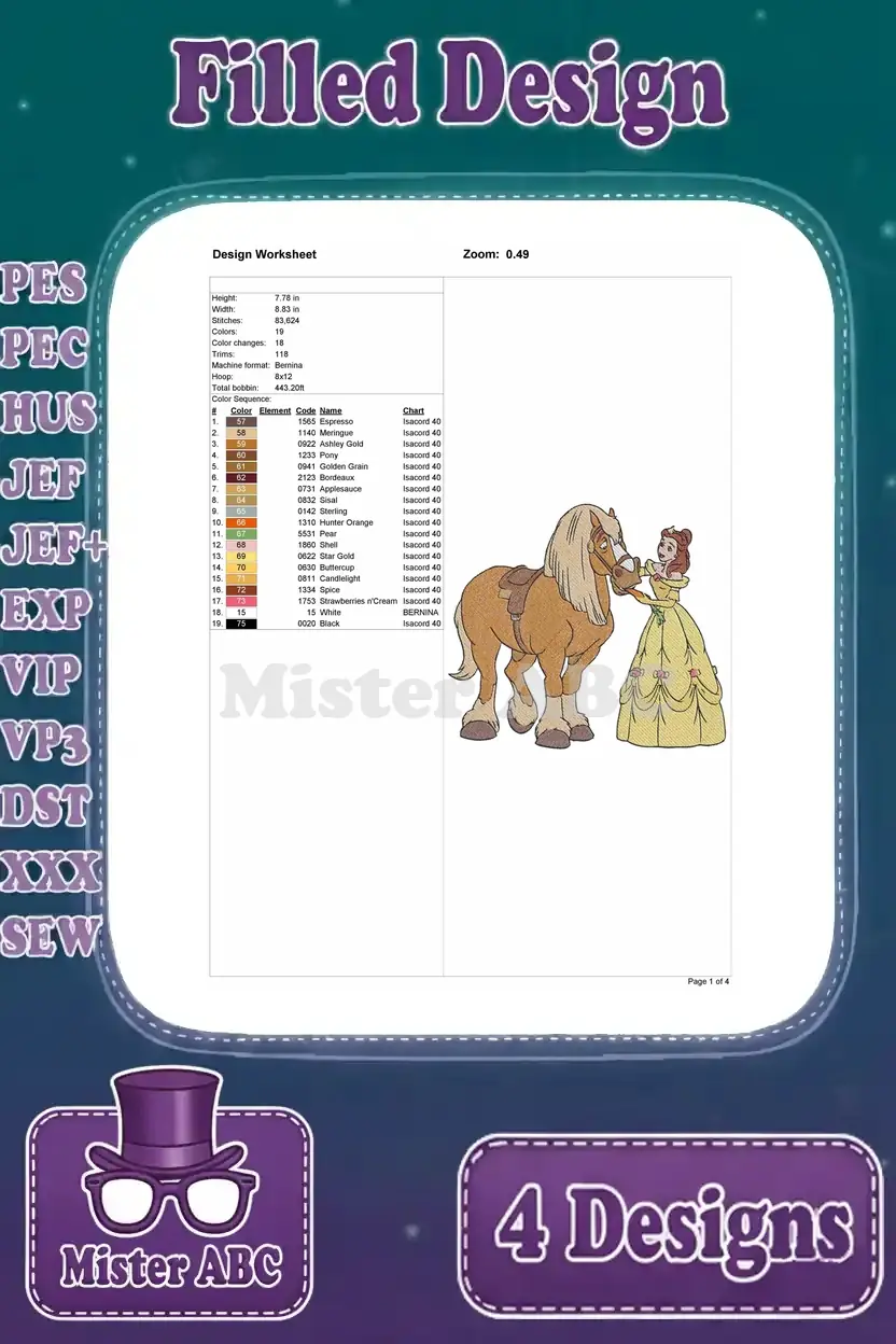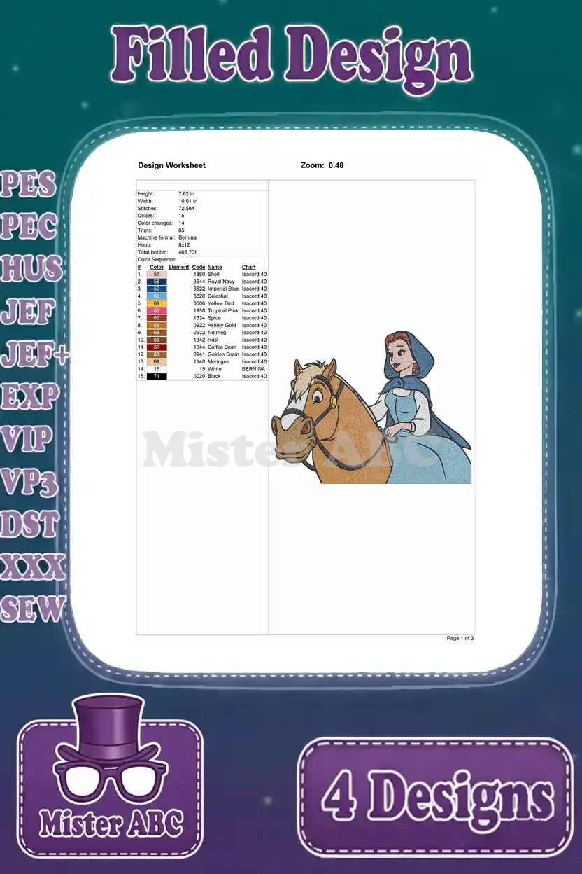 Beauty And The Beast Belle Yellow Ballgown And Blue Dress With Her Horse Philippe – Filled Embroidery Design