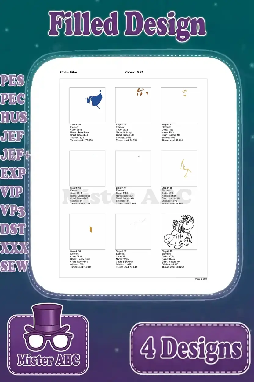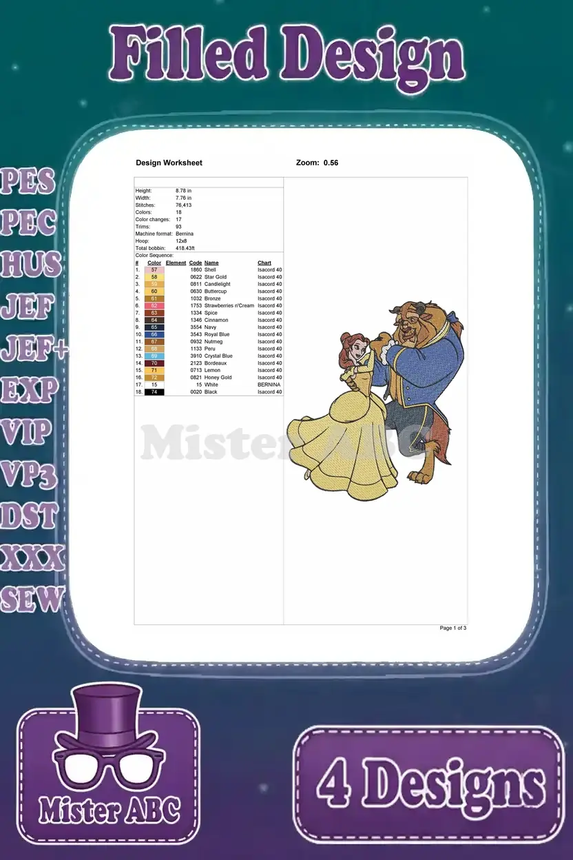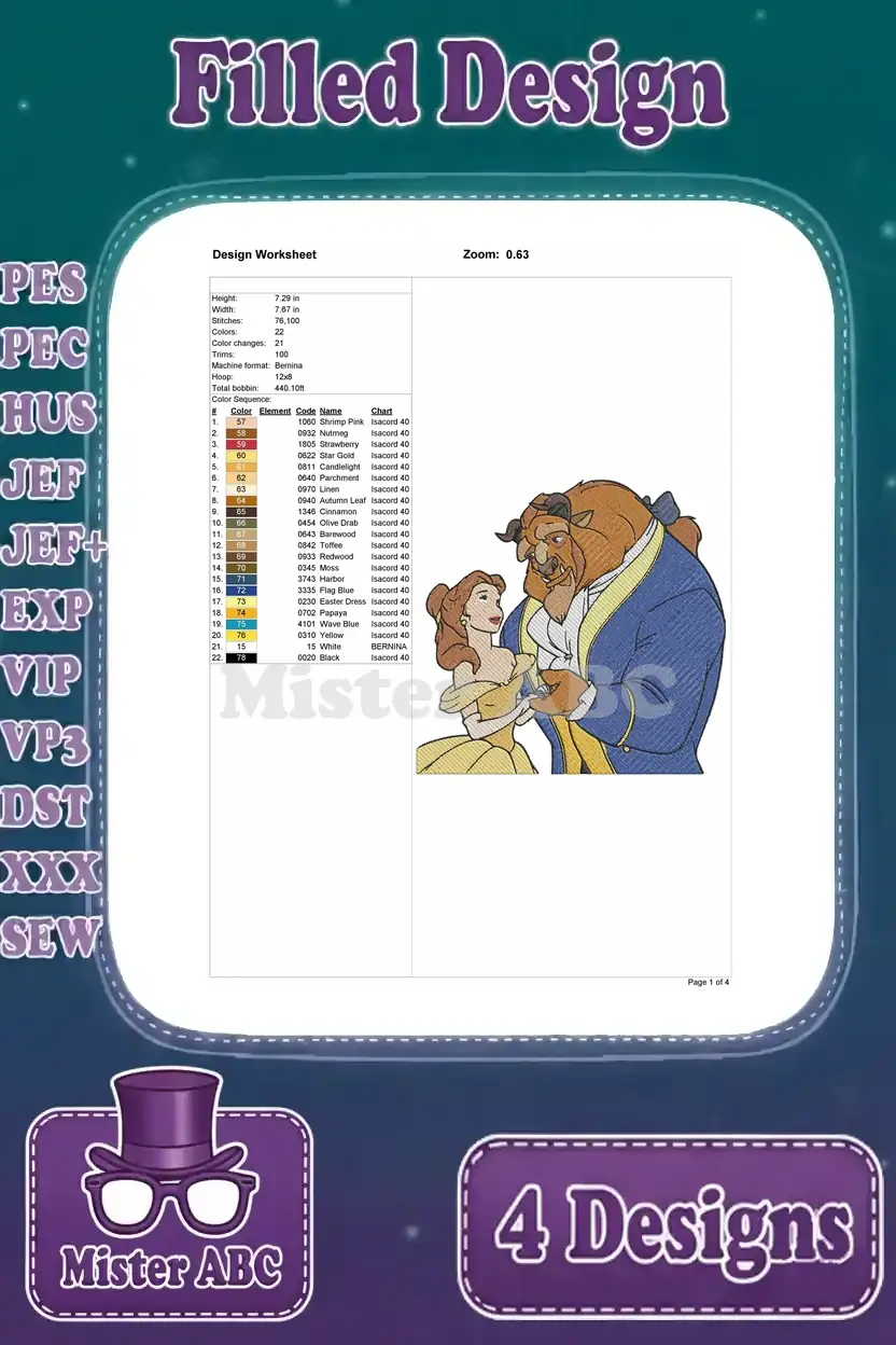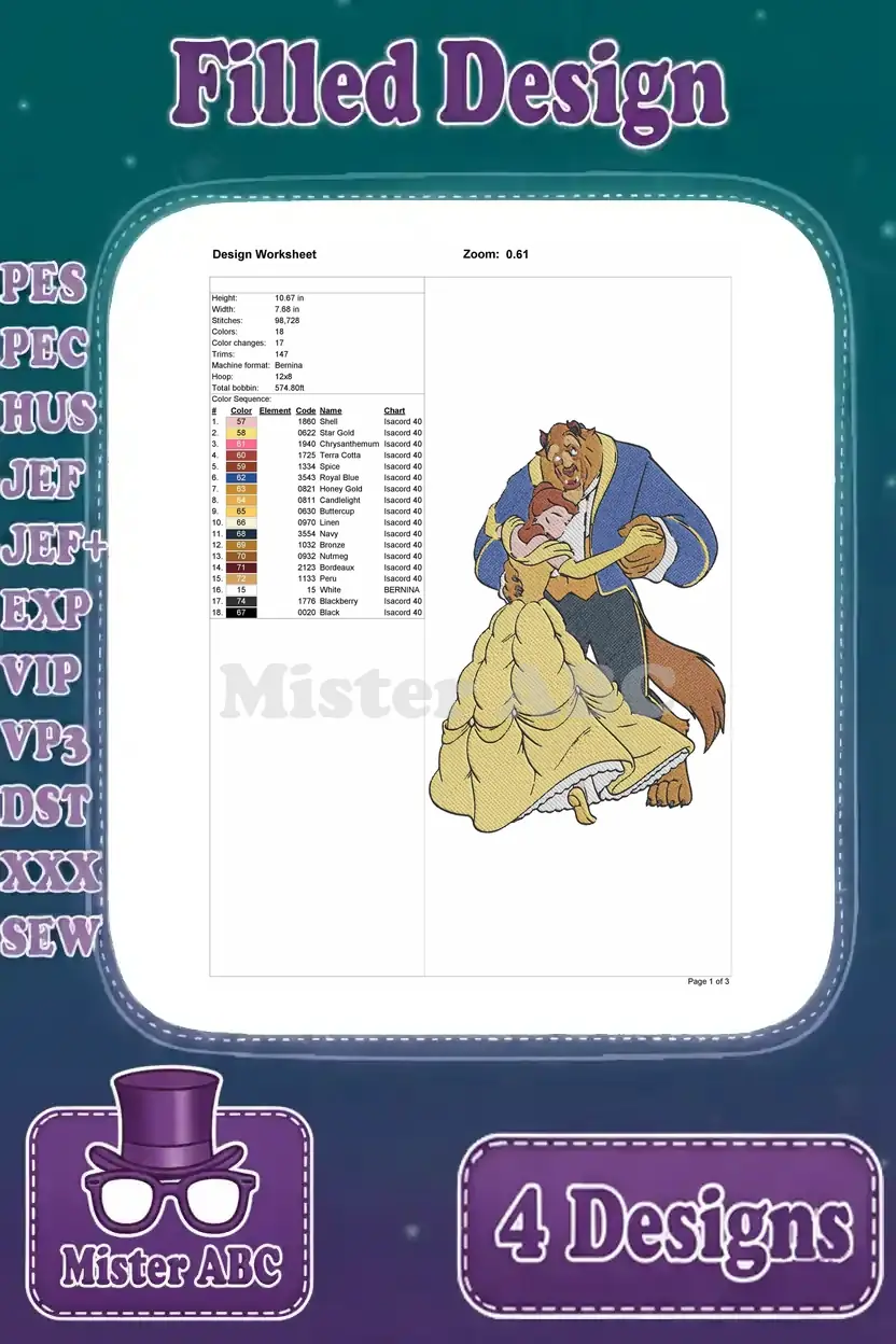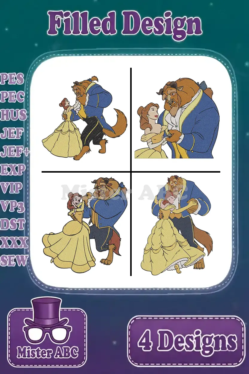 Beauty And The Beast Belle Yellow Ballgown Beast Dancing Close Up And Full Body – Filled Embroidery Design