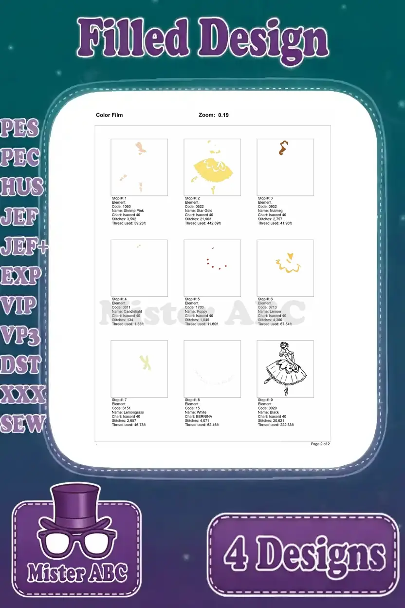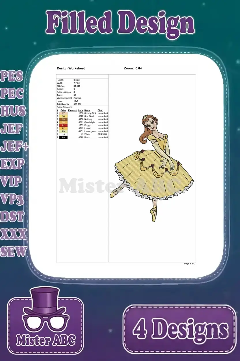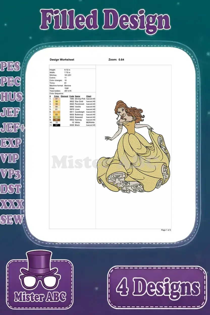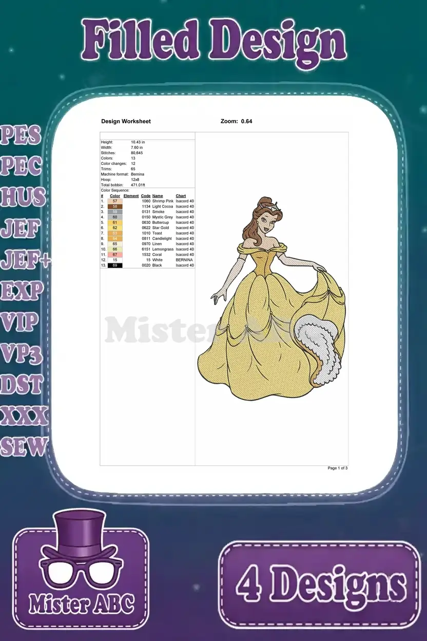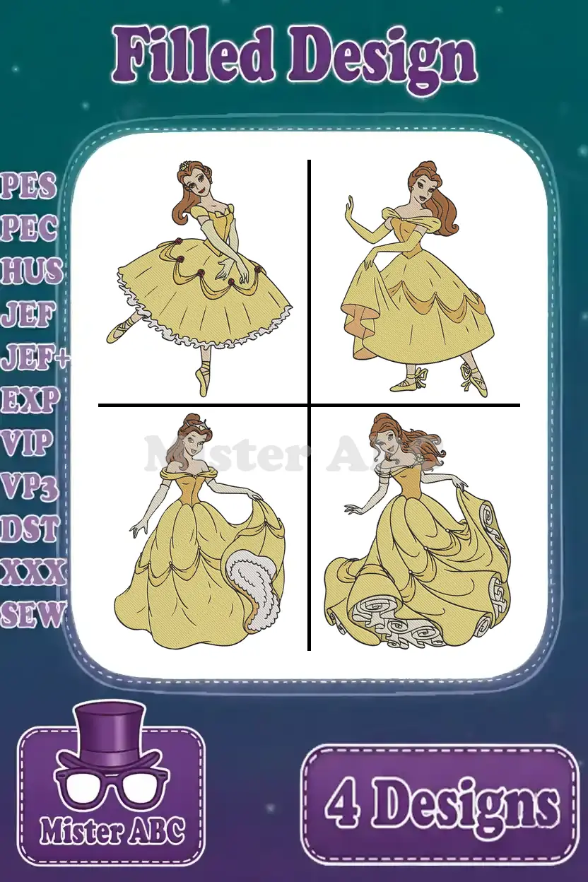 Beauty And The Beast Belle In Yellow Ballgown Elegant Dancing And Posing Collection – Filled Embroidery Design