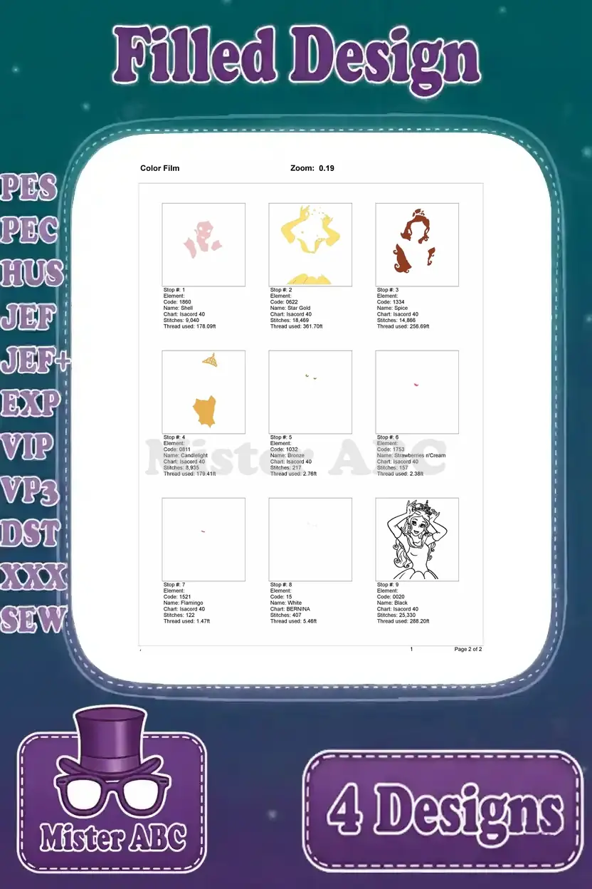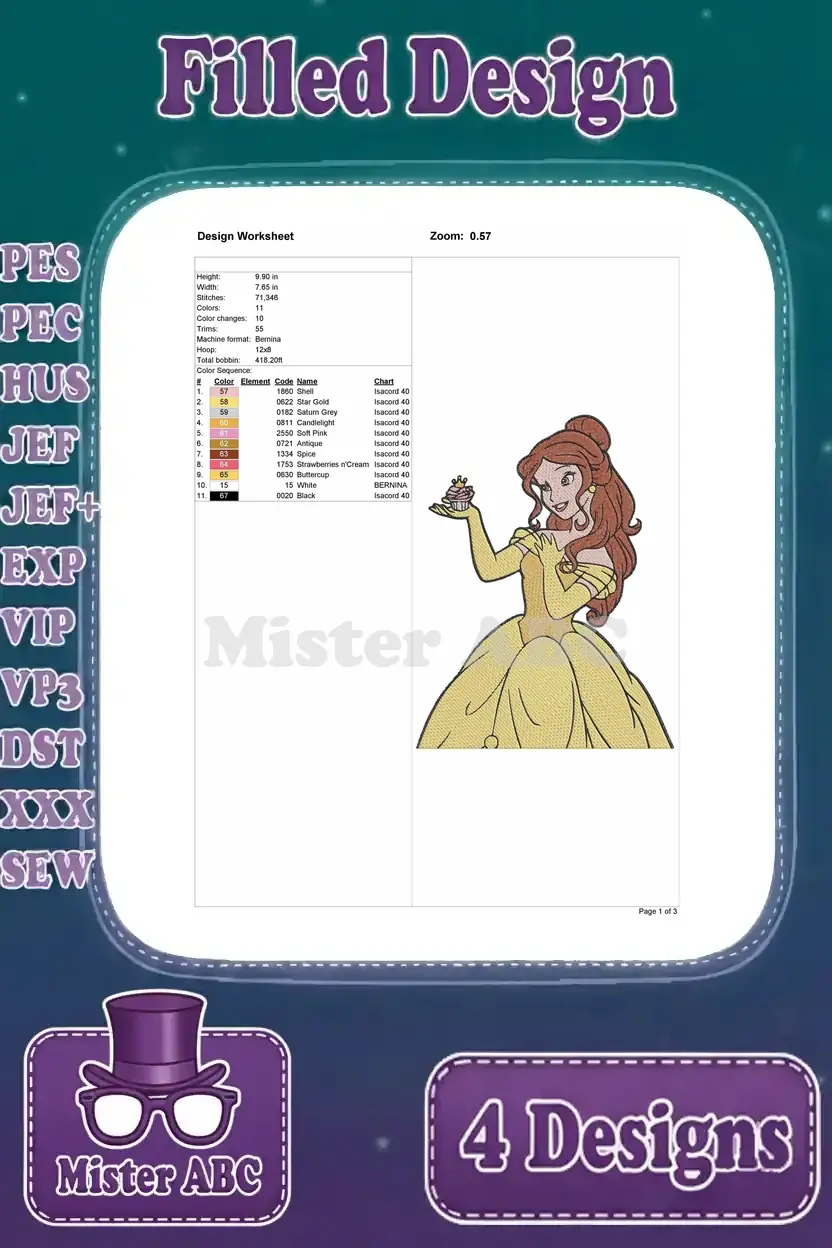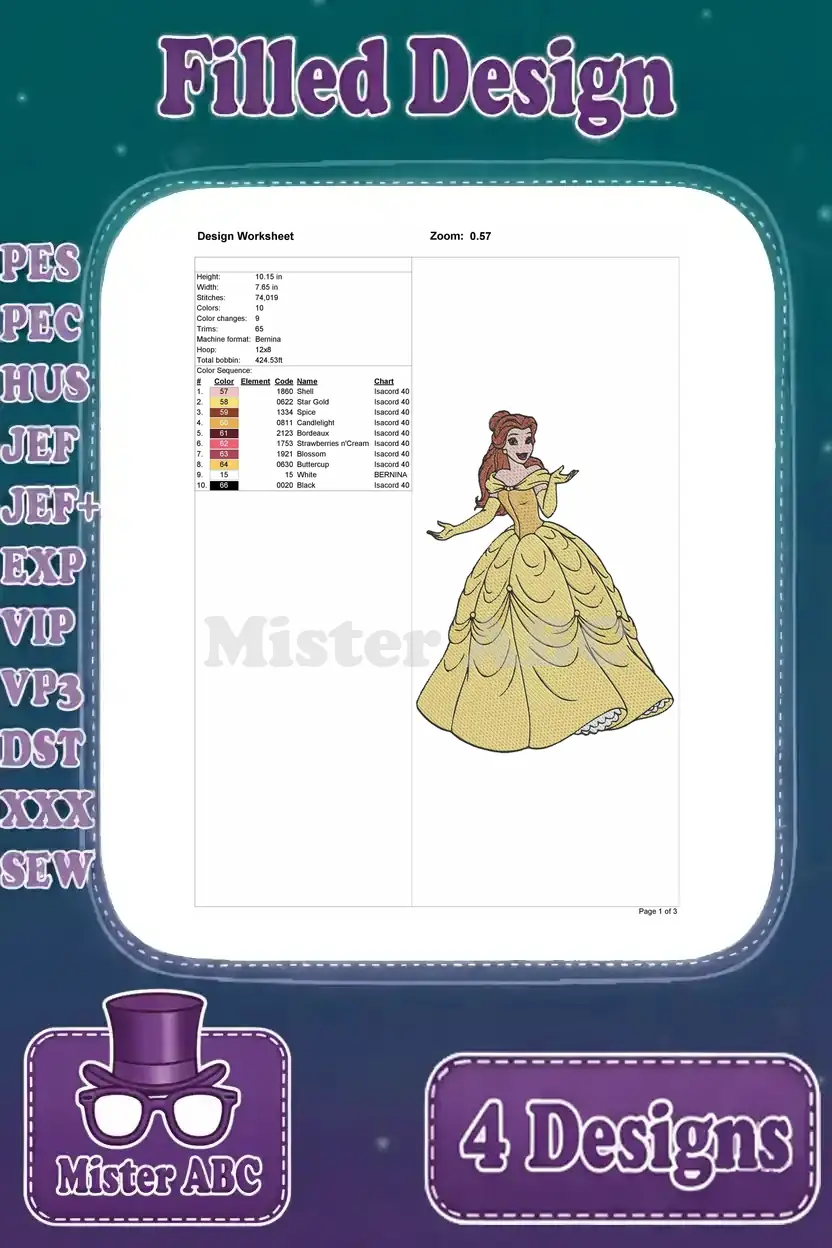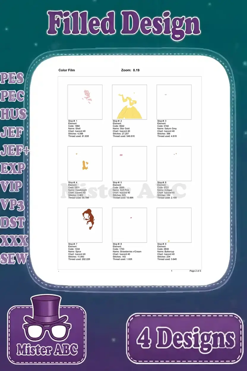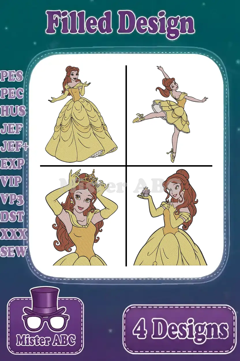 Discover enchanting Belle embroidery designs! A delightful collection featuring four unique, filled stitch poses perfect for any project.