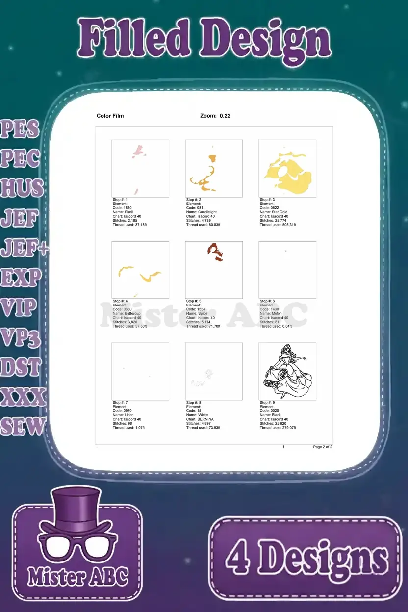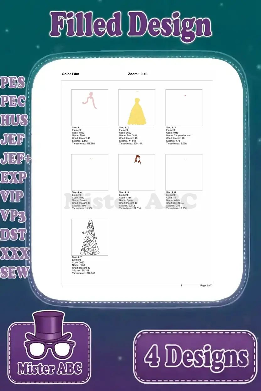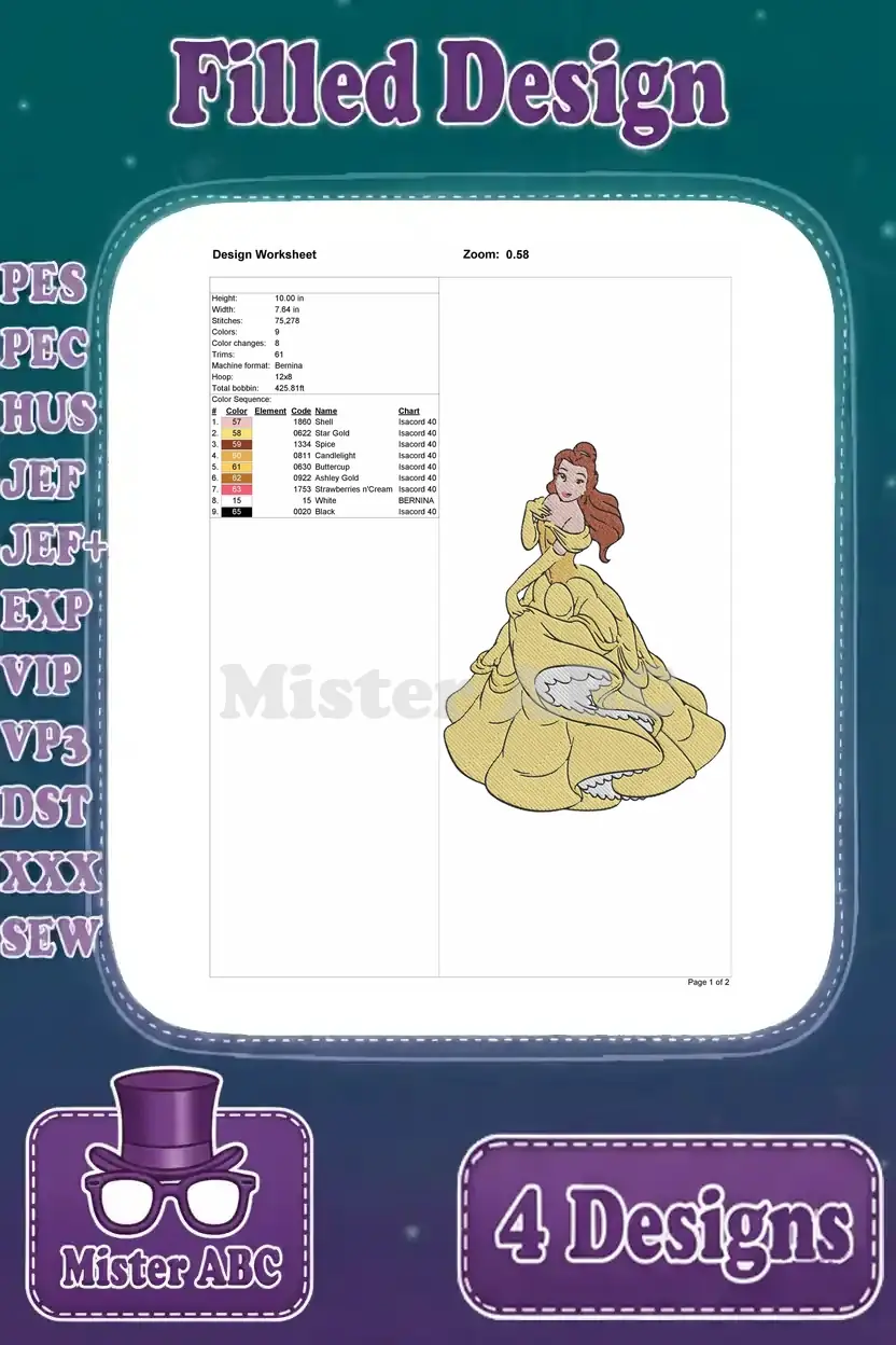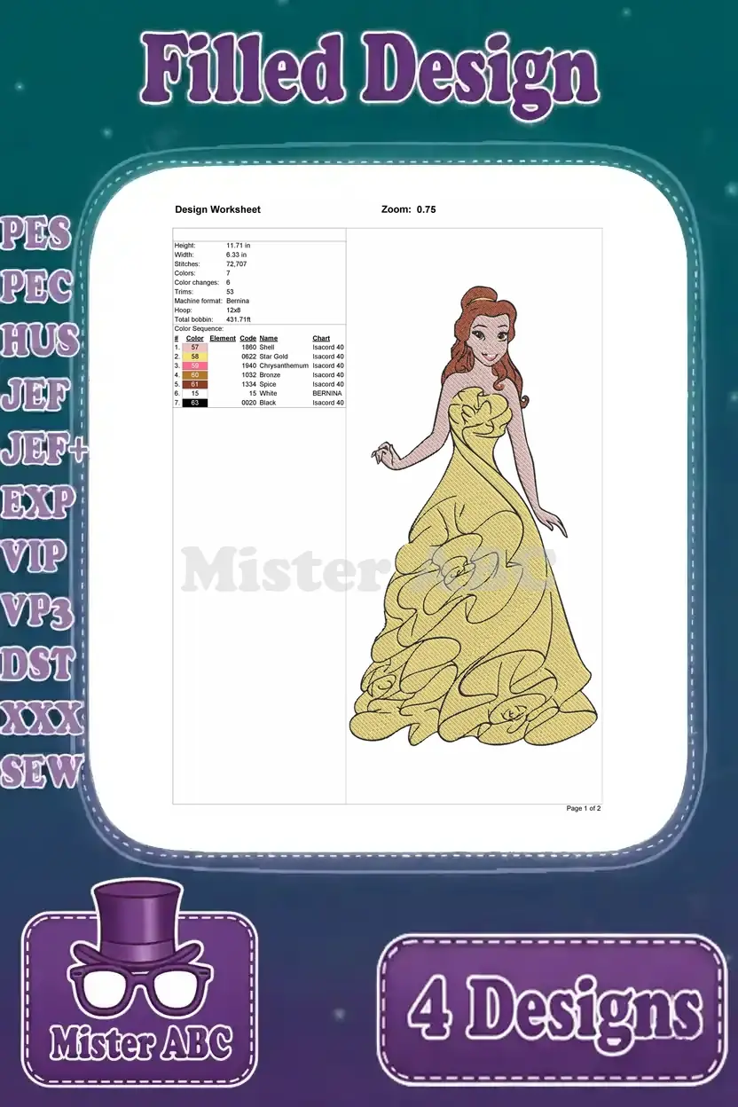 Beauty And The Beast Belle Yellow Ballgown Portrait Shots And Full Figure Elegance – Filled Embroidery Design