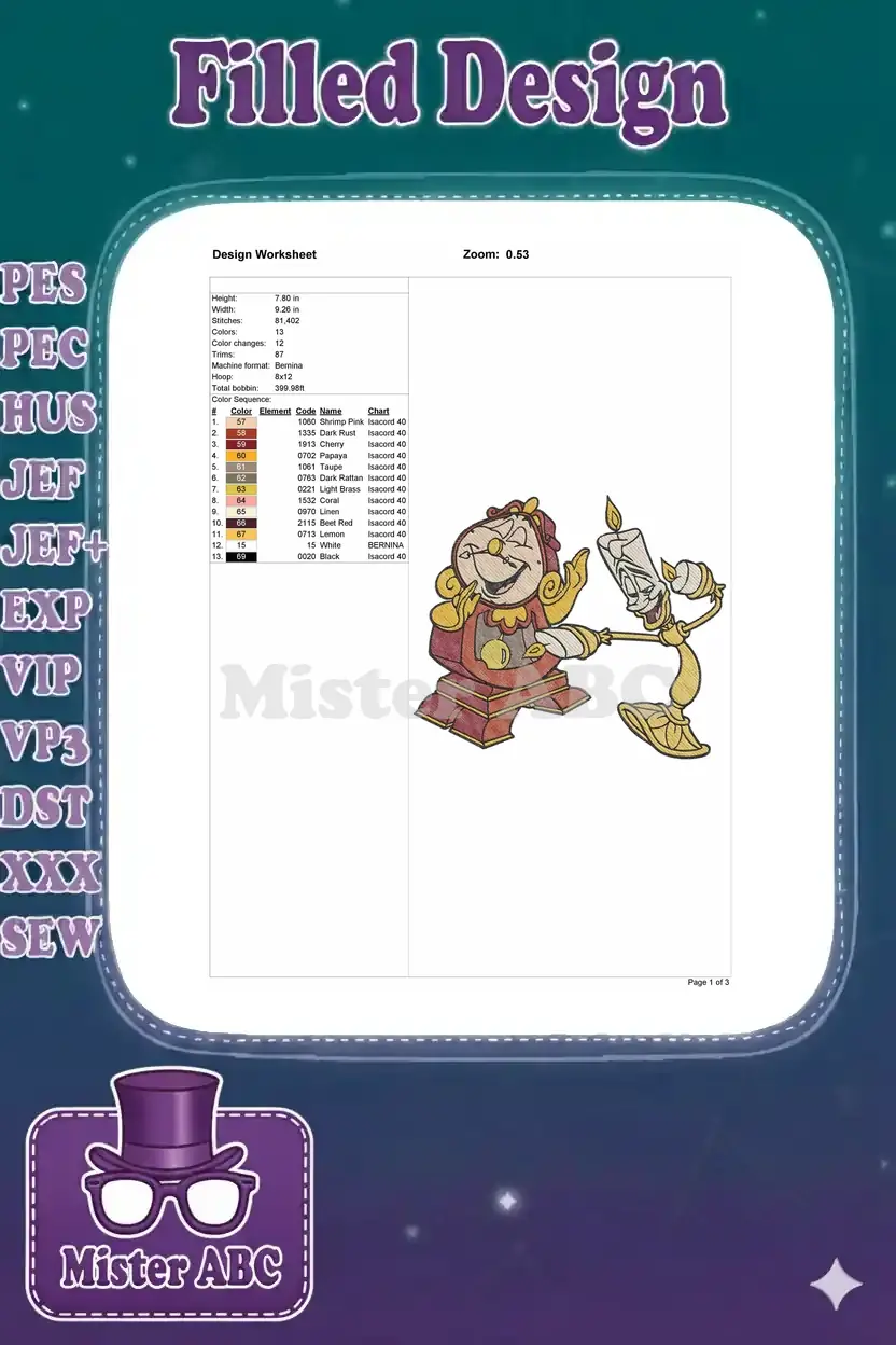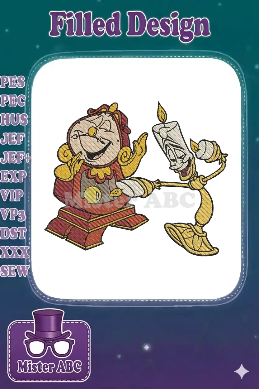 Beauty and the Beast Cogsworth Lumiere Happy Embroidery Designs