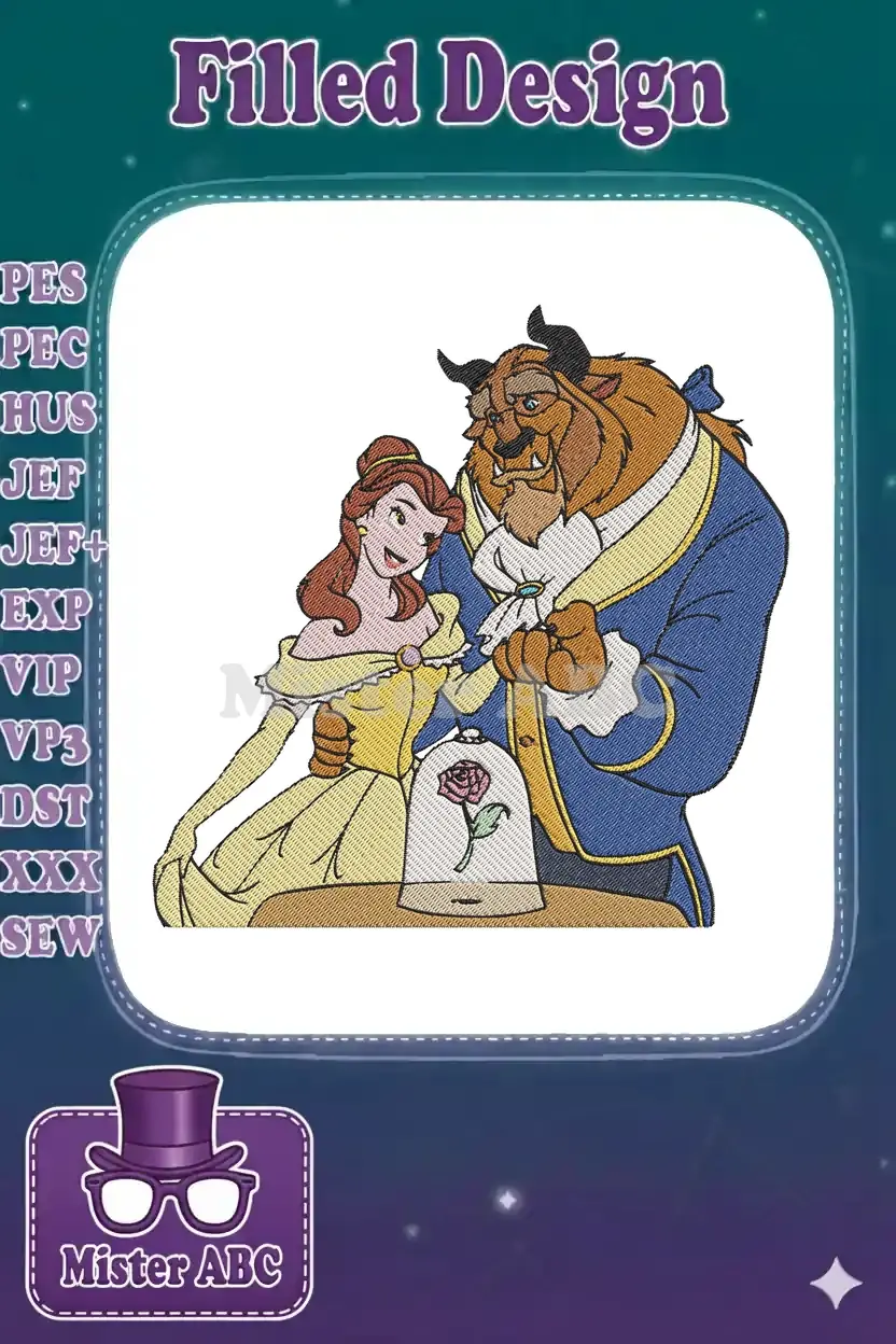 Beauty and Beast fairytale couple with enchanted rose embroidery designs