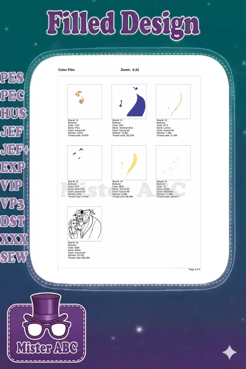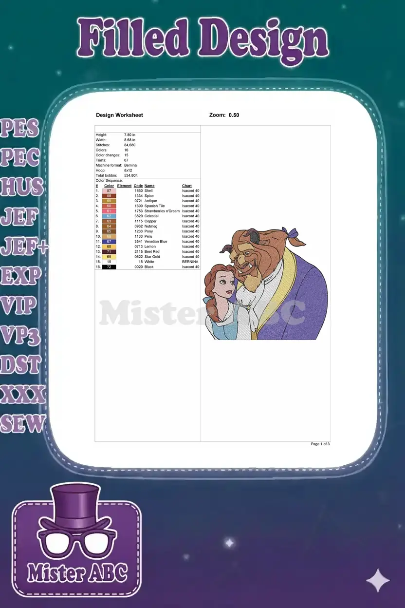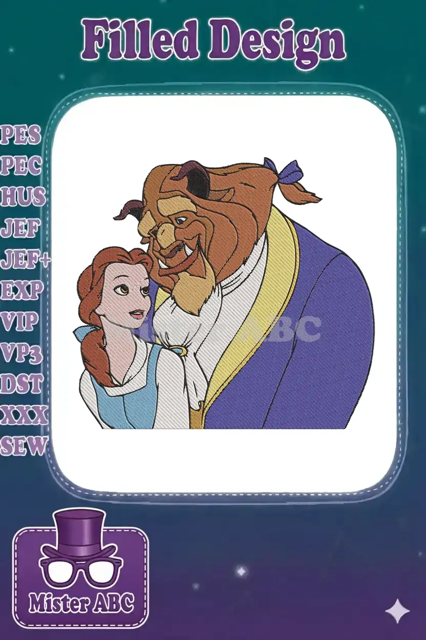 Embrace timeless romance with this exquisite embroidery design featuring Belle and the Beast, perfect for any fan.