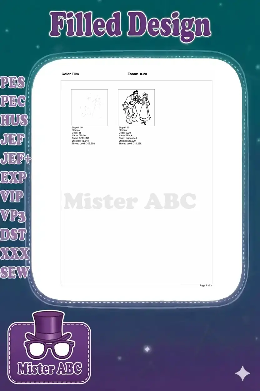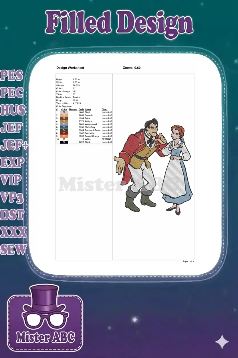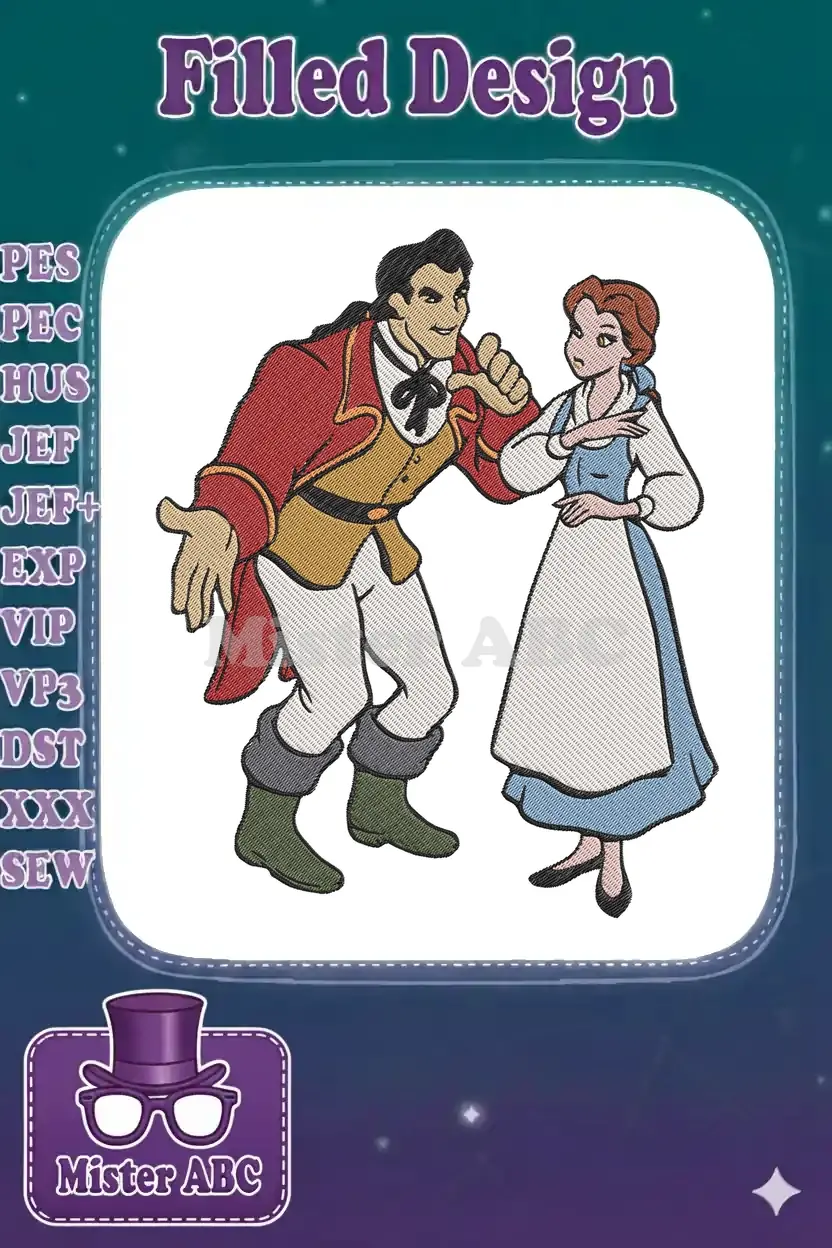 Bring the classic tale to life with this detailed embroidery design featuring Gaston and Belle from Beauty and the Beast. Perfect for fans!