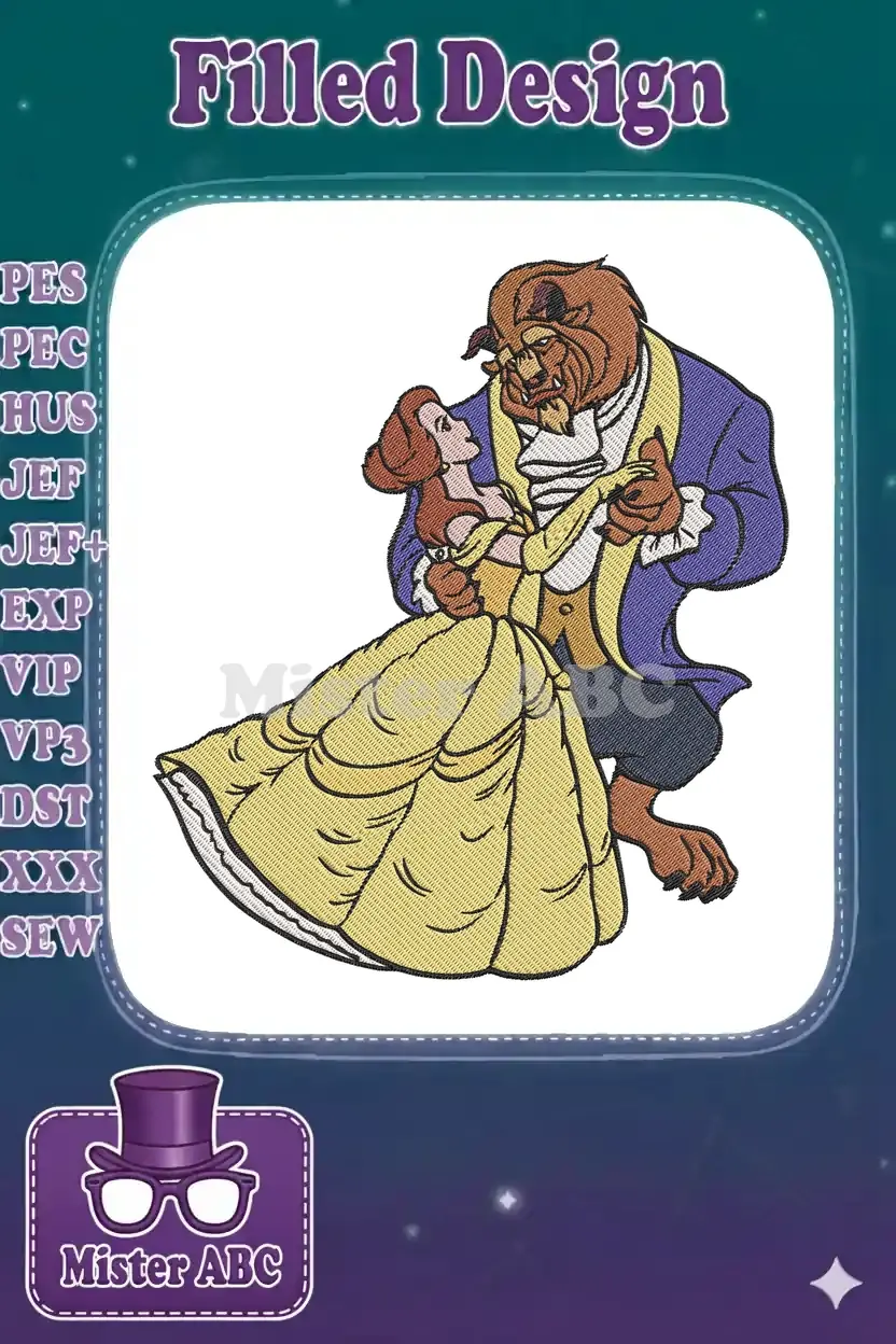 A captivating embroidery design showcasing Belle and the Beast in their iconic dance, perfect for adding magic to any item or garment.