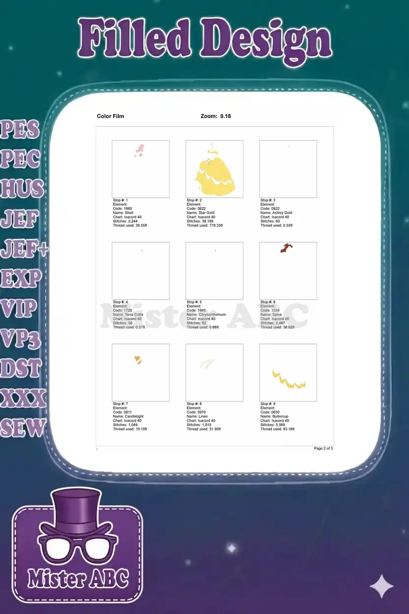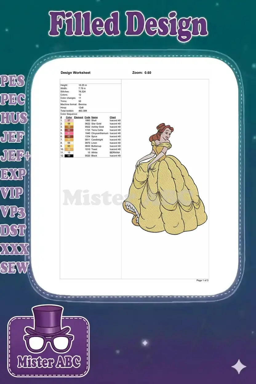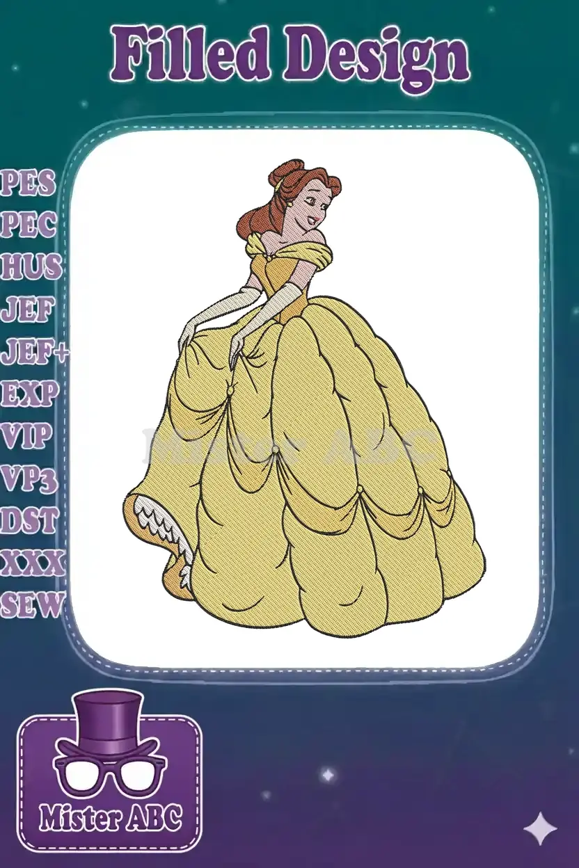 An enchanting embroidery design featuring Disney’s Belle in her iconic yellow ball gown, perfect for fairytale projects and magical creations.