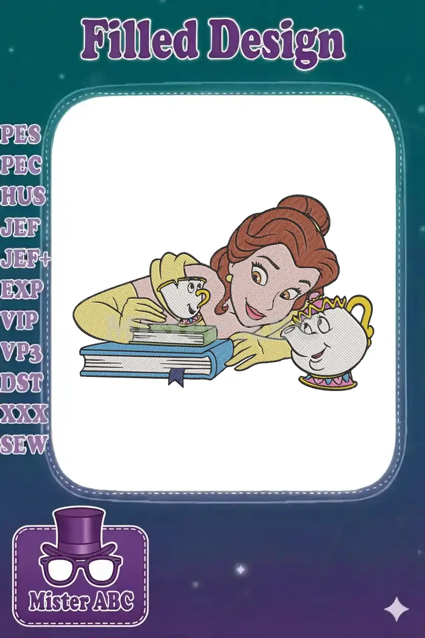 Belle, Chip, and Mrs Potts with books embroidery designs