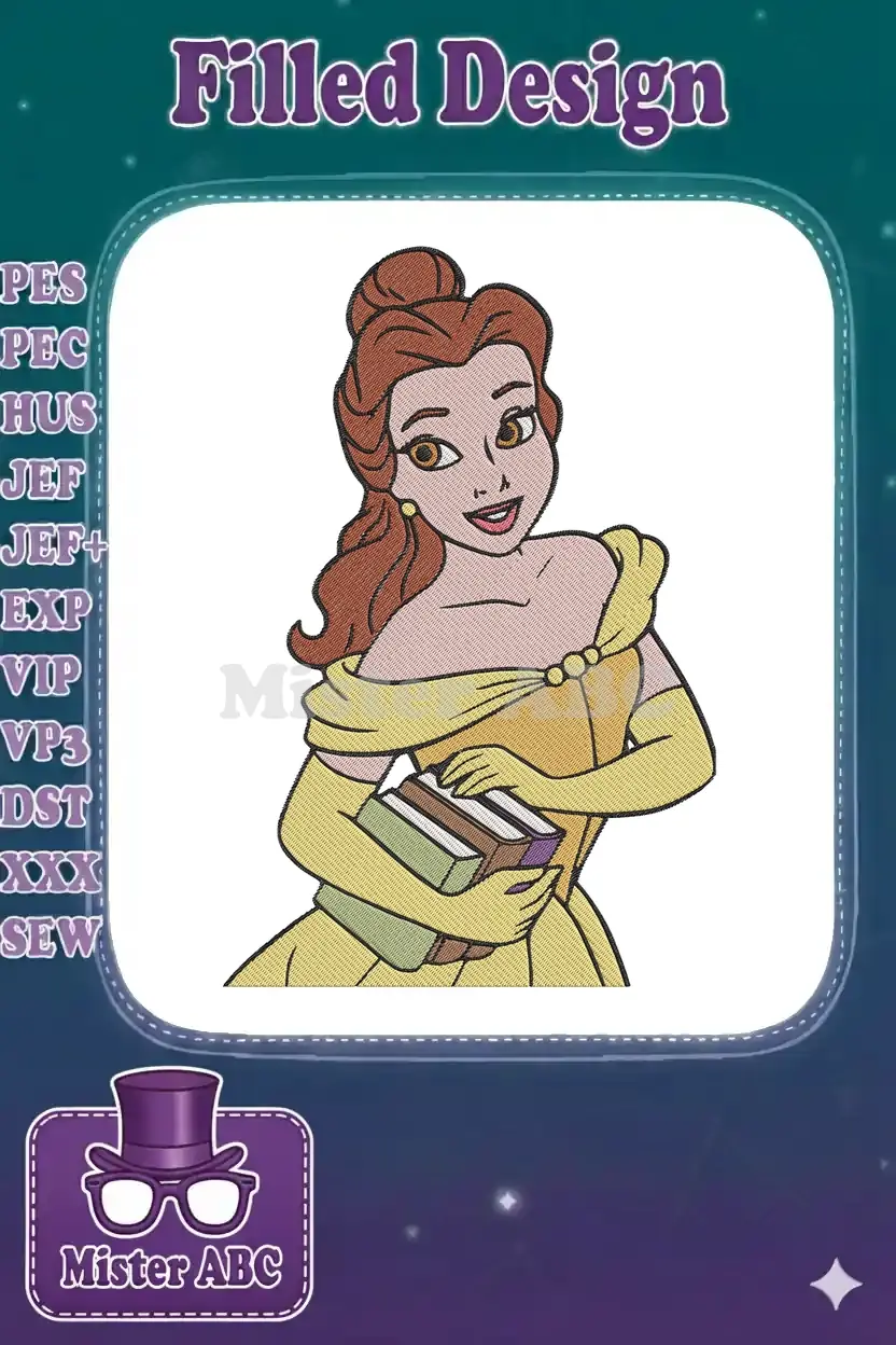 Belle Disney Princess with Books Yellow Gown Embroidery Designs