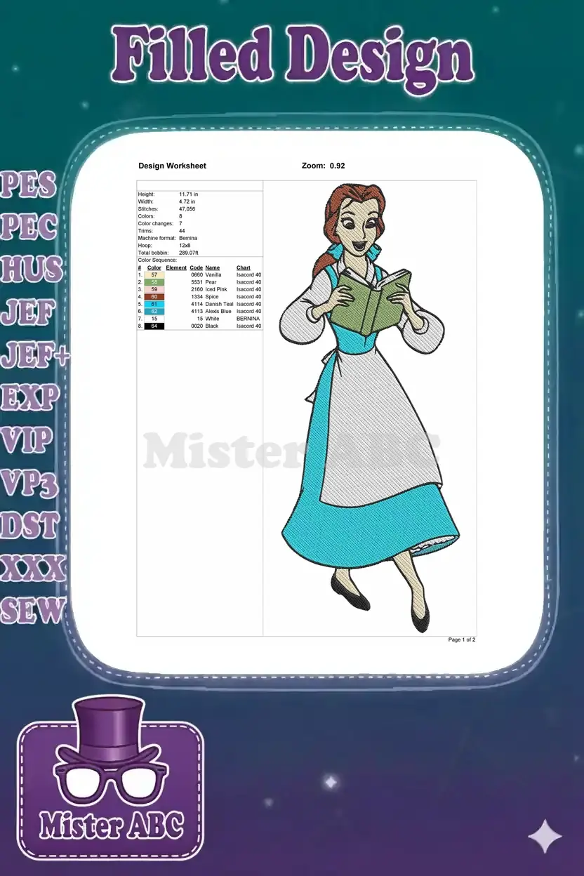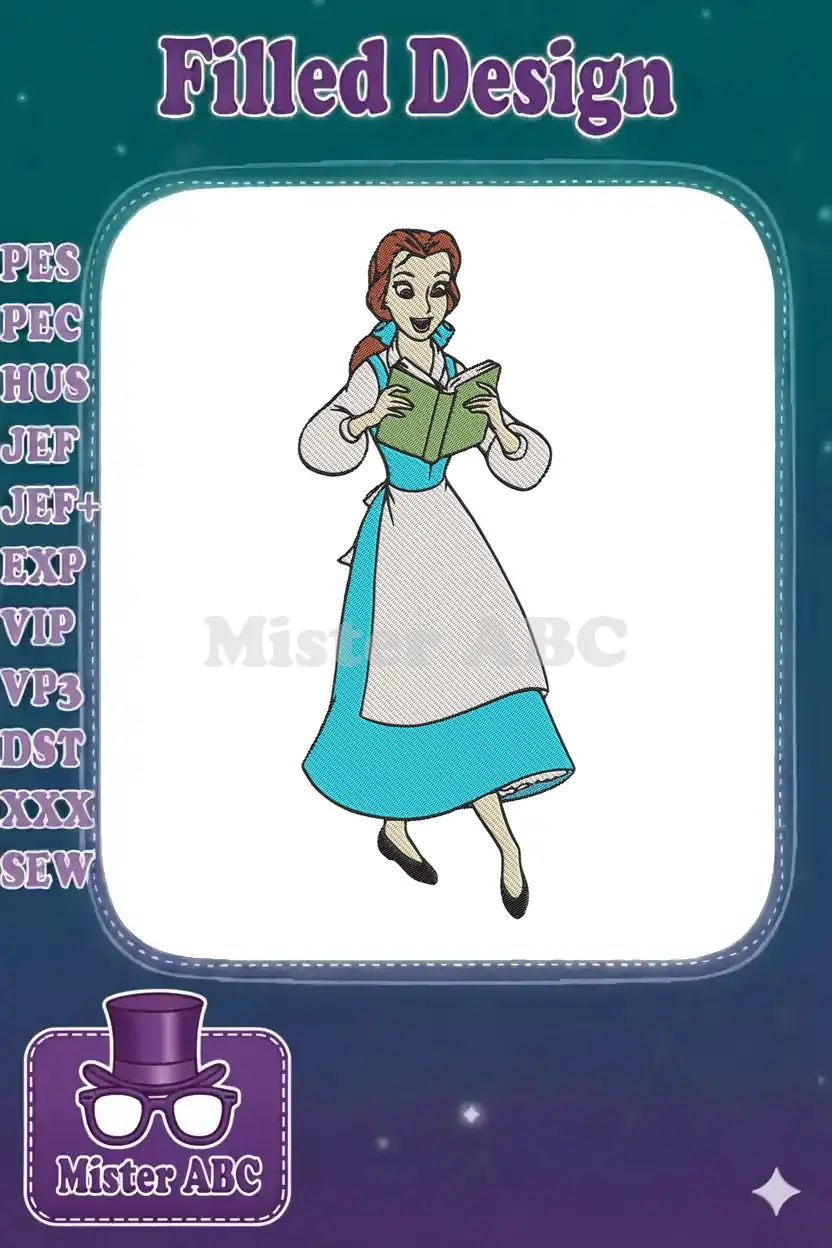 Belle Disney Princess Reading Book Character Embroidery Designs