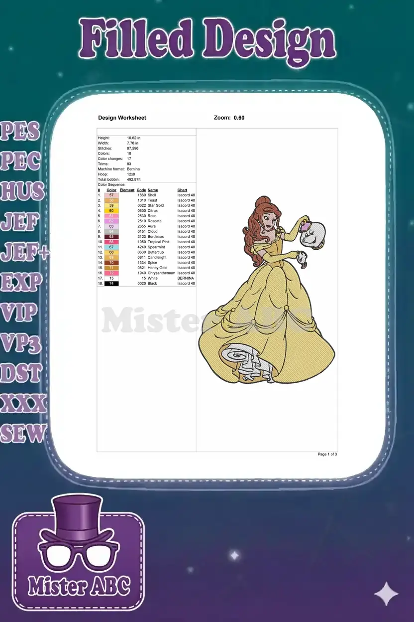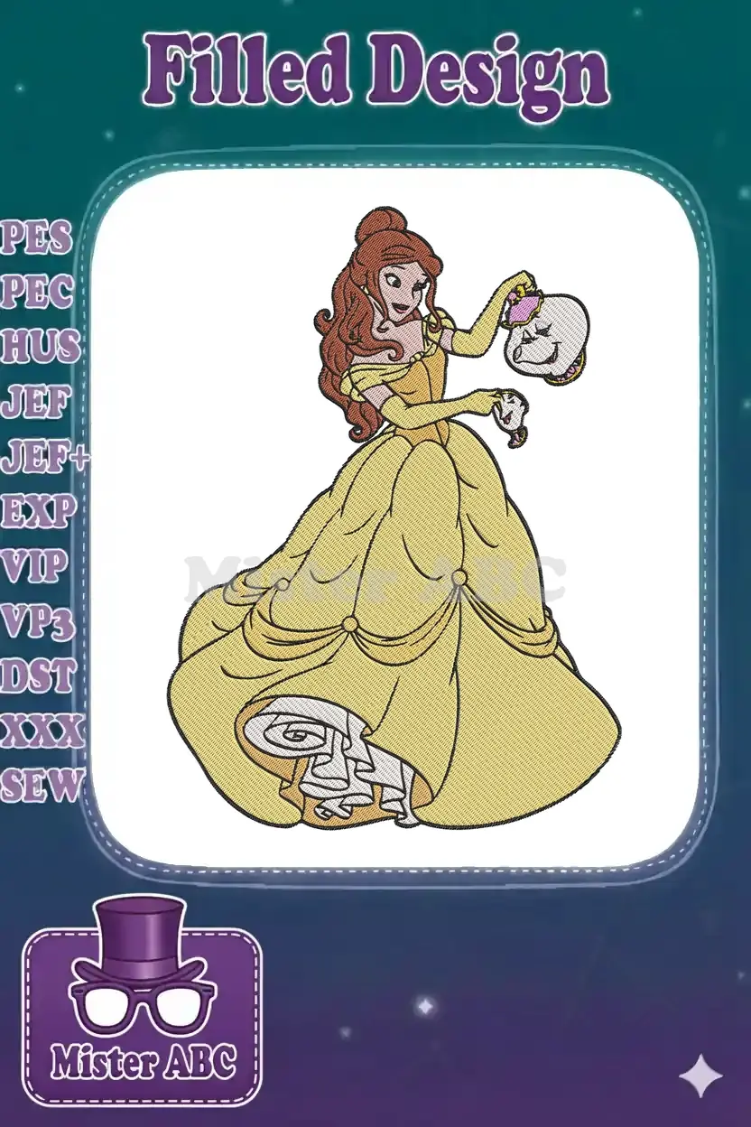 Embrace the magic with this enchanting embroidery design of Princess Belle in her iconic yellow gown.