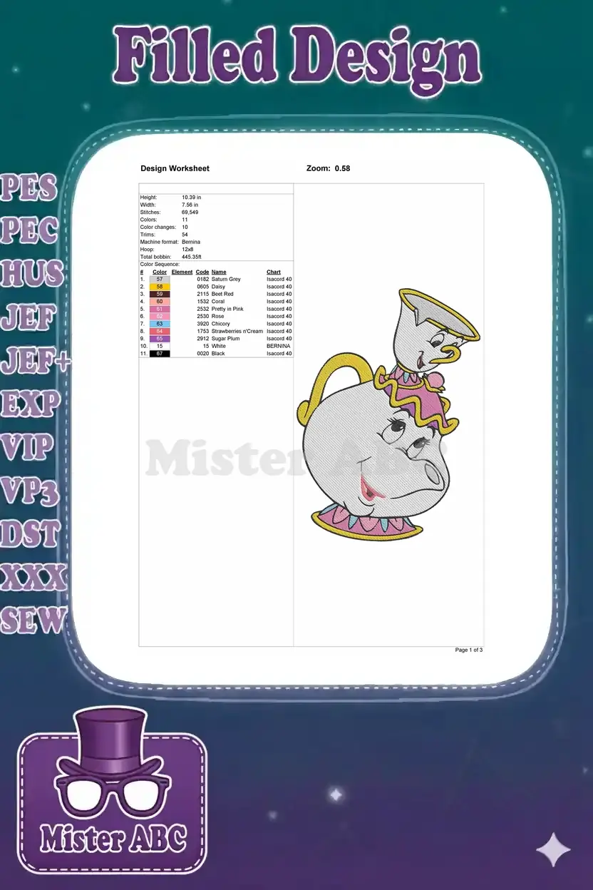 Beloved Disney Beauty and the Beast Mrs. Potts Chip embroidery designs – Instant Download